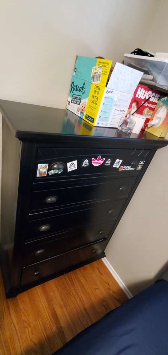 Great condition! All drawers work well, one of them is a bit squeaky. Very few nicks or scratches. Stickers on the front and side. 52.5" x 37" x 17.5"