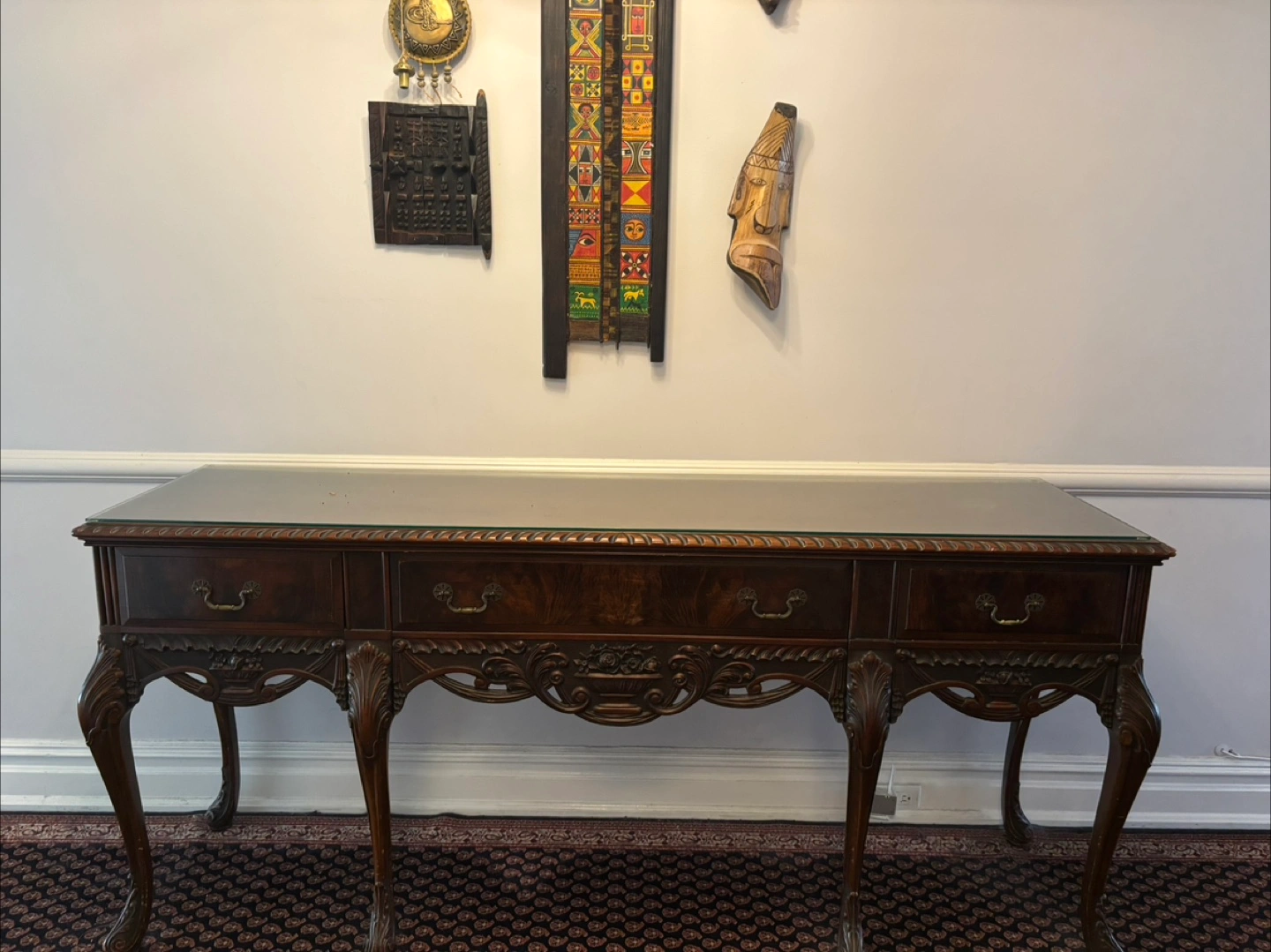 Selling a beautiful vintage console table with a glass top! It features a dark wood finish and ornate carved details on the legs and front. It would be a great addition to any entryway or living room