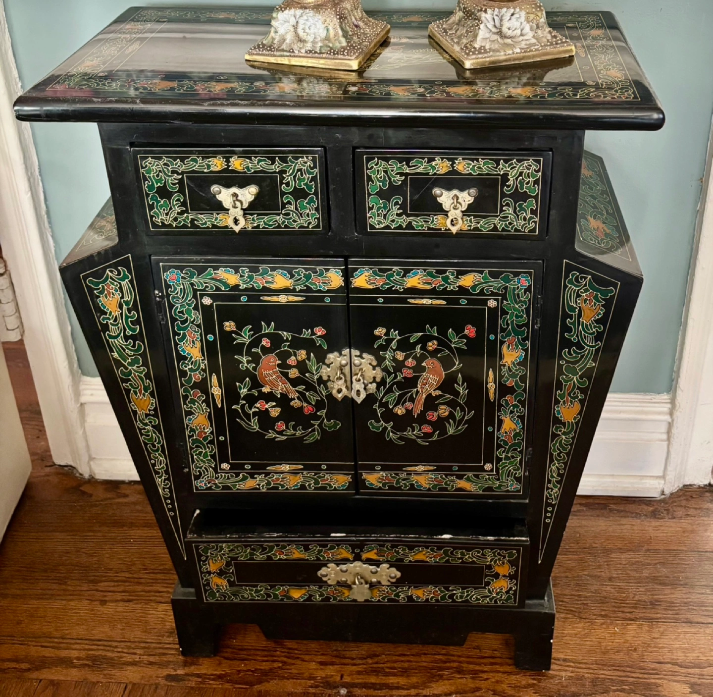 Selling a beautiful black lacquer accent cabinet. It has a unique bird design with floral accents. The cabinet features drawers and doors for storage. Perfect as a side table or decorative piece!