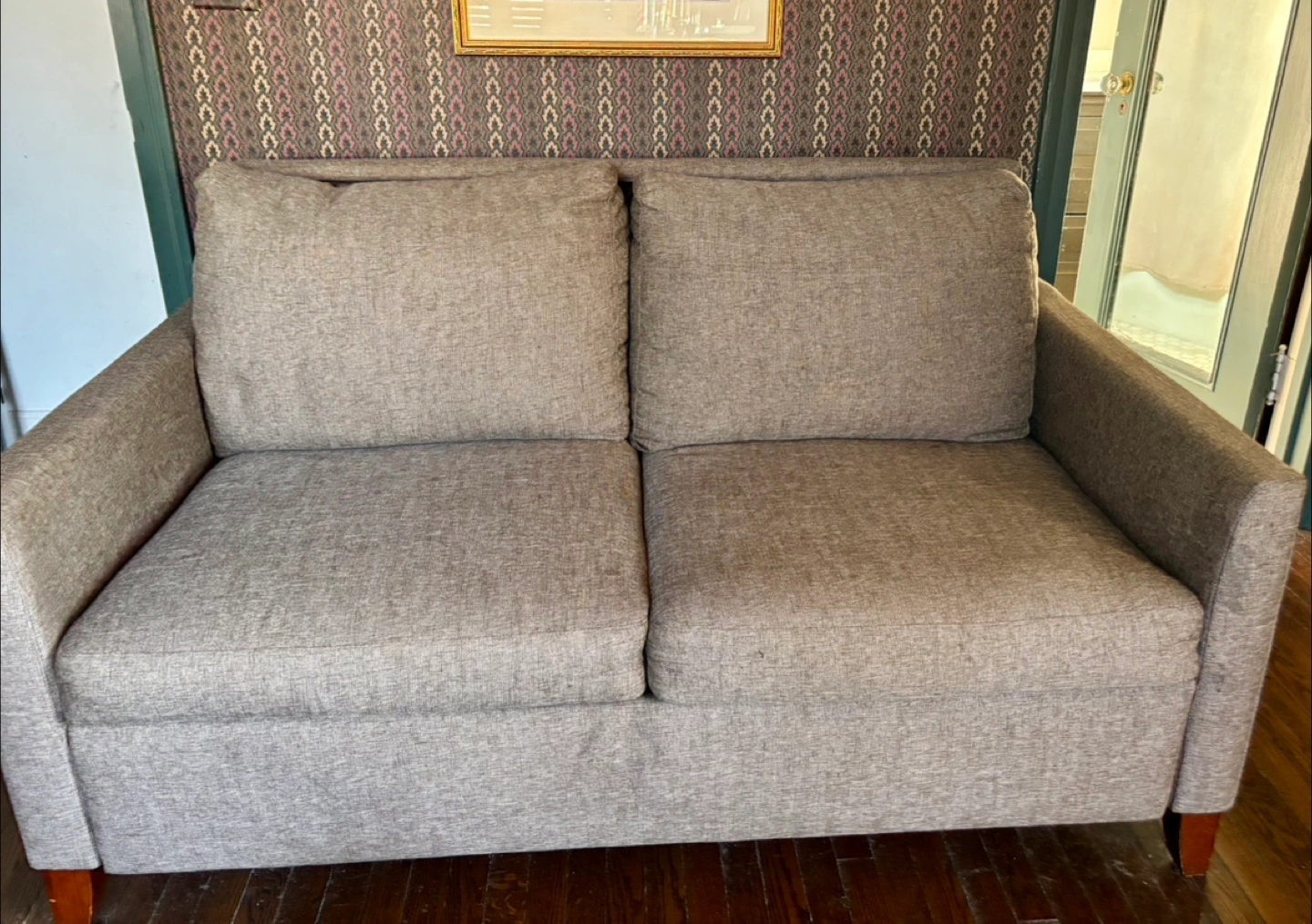 Selling a cozy loveseat sofa bed in a neutral gray color! It's in good condition and ready for a new home. Perfect for small spaces or as an addition to your living room setup
