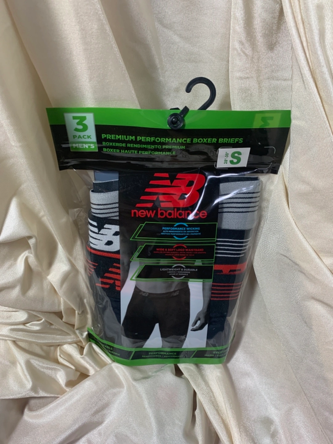 New Balance premium performance boxer briefs, 3 pack, size small (28-30"). They feature performance wicking material and a wide, soft logo waistband. Lightweight and durable!
