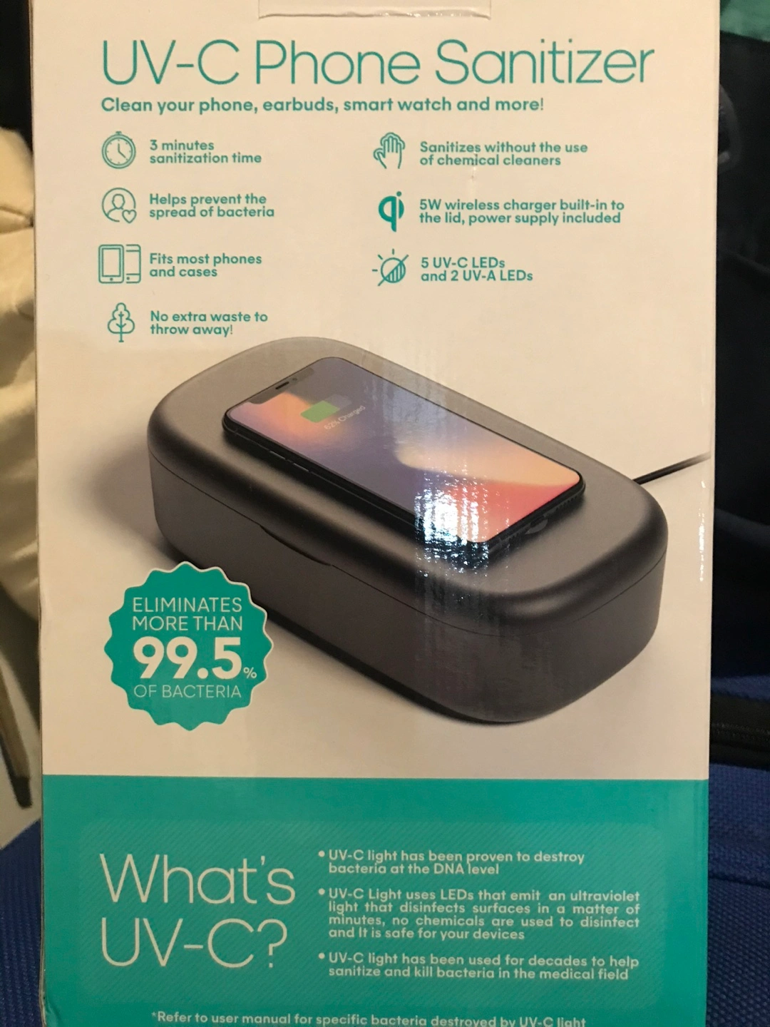 This will help sanitize your phone fast & prevent the spread of bacteria. It wirelessly charge your device while sanitizing and no chemicals are used to disinfect your device. It fits most phones and cases. From smoke pet free and healthy home.