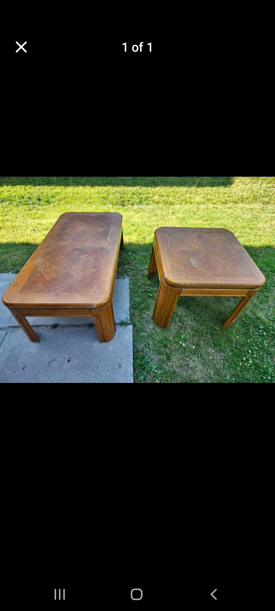 Selling a coffee table and matching side table set. They have a wood finish and a classic design. Perfect for a living room or family room setup