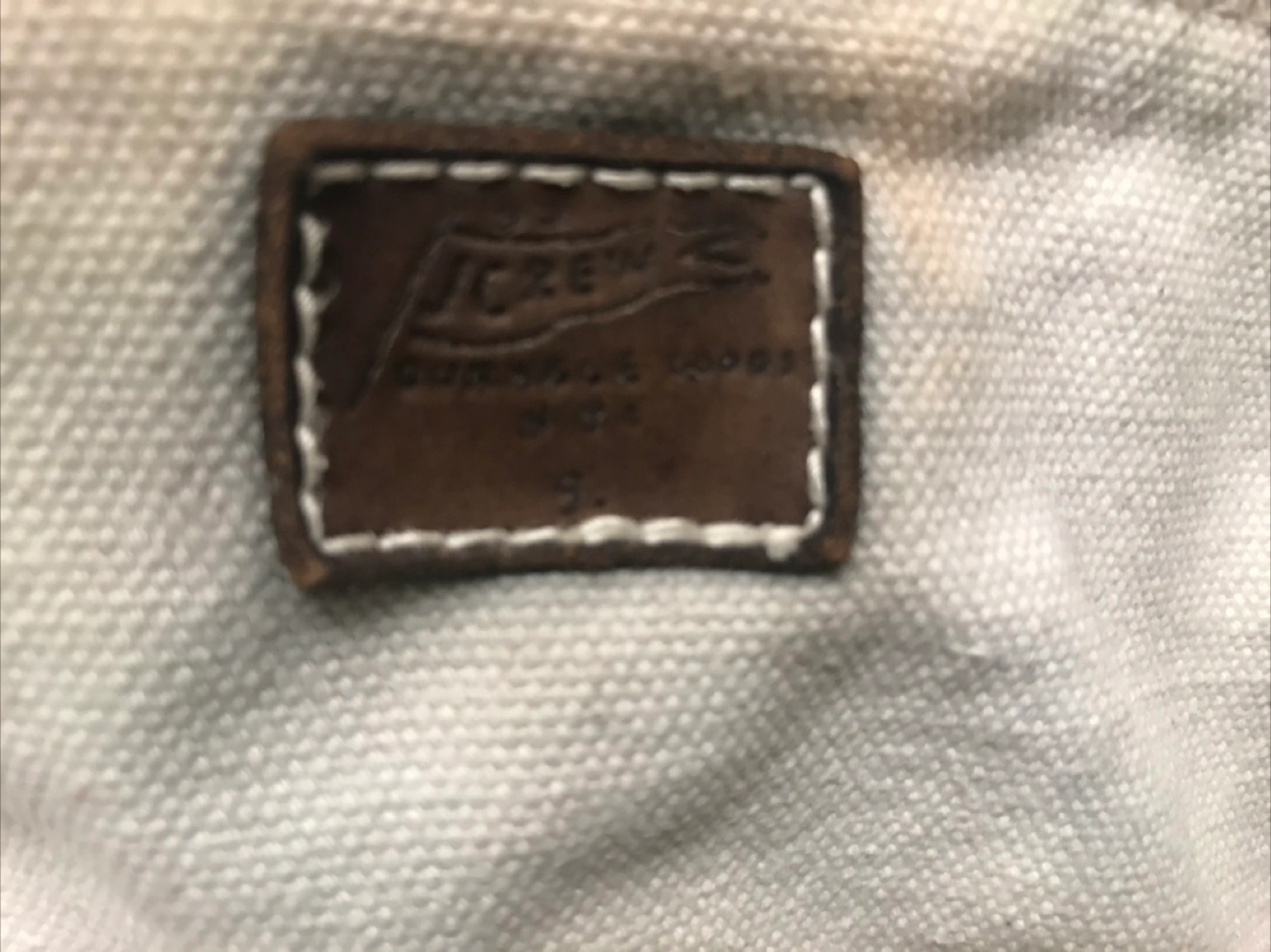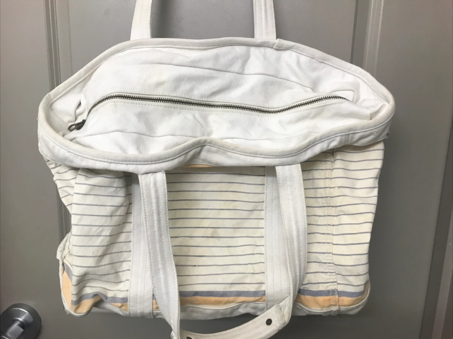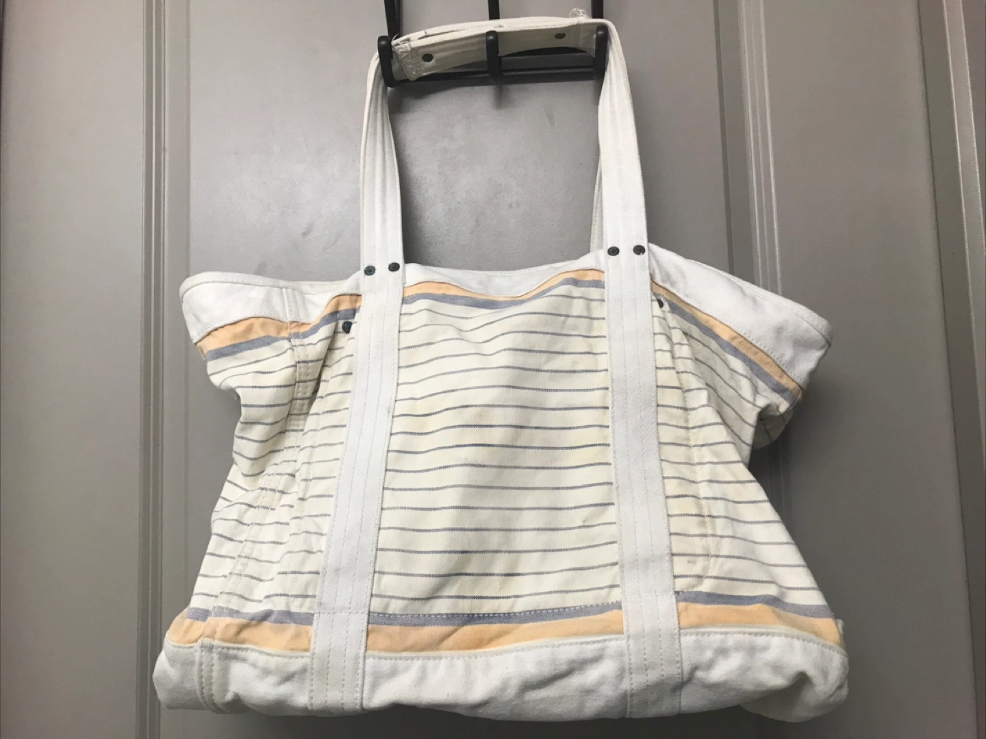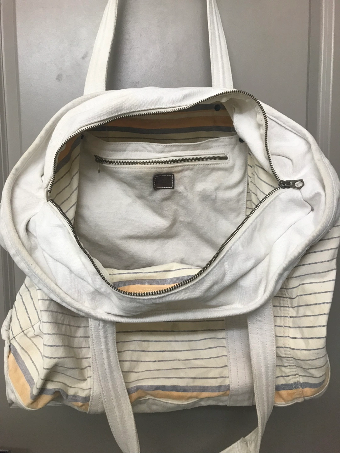 J Crew Heavy Duty XL Stripped Canvas Tote Bag. Although this vintage style bag is used, but overall still in excellent condition and great shape. Some signs of wear and slight stains, not so visible. Zipper functions and there are 2 pockets inside. From smoke pet free and healthy home.