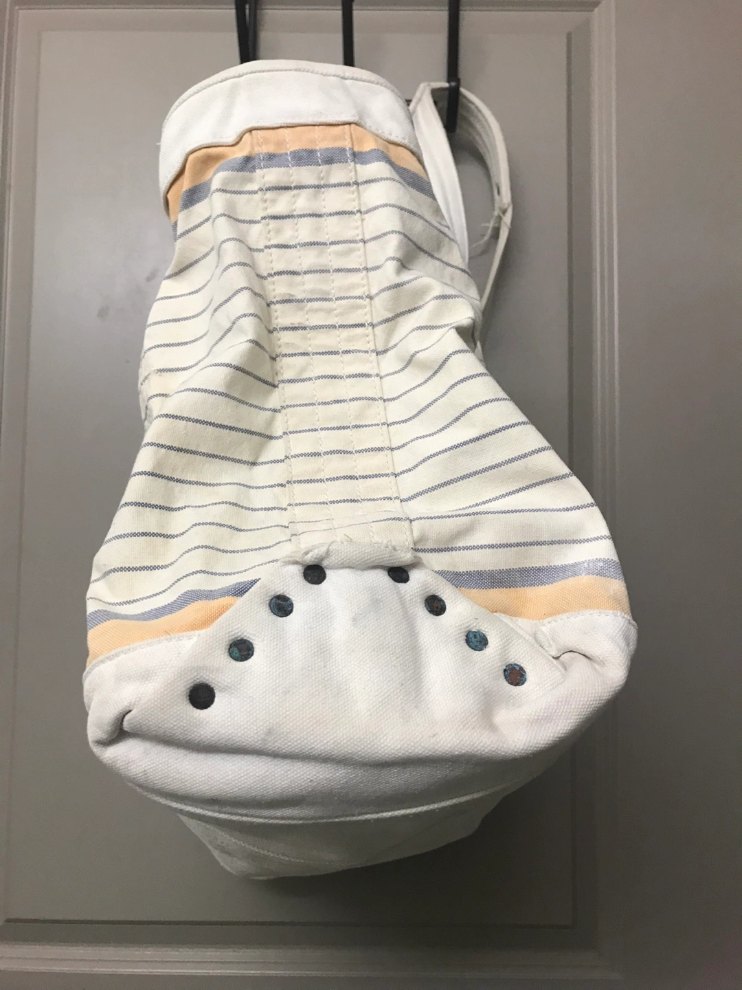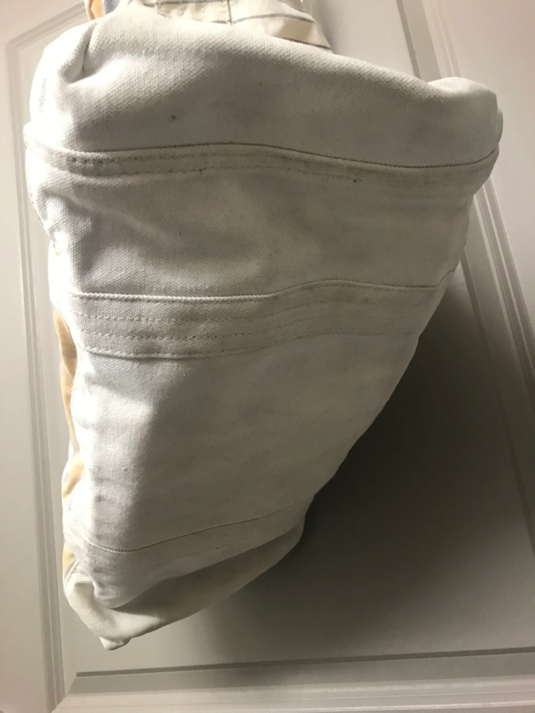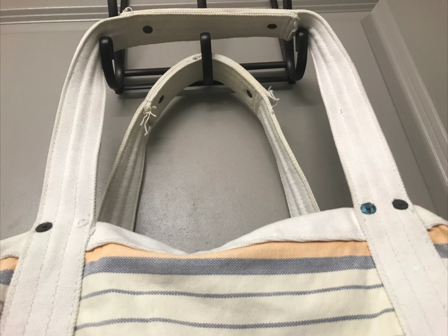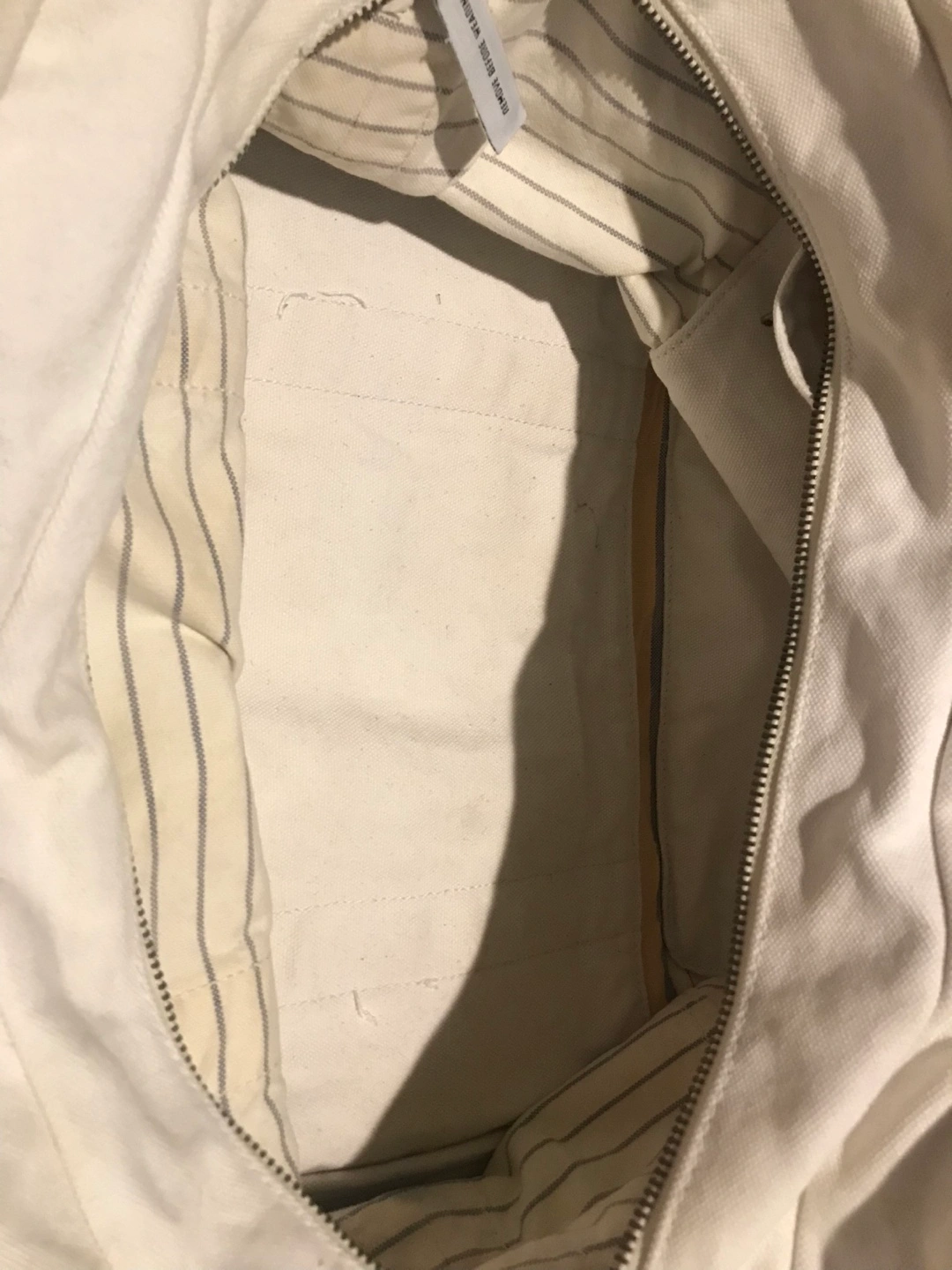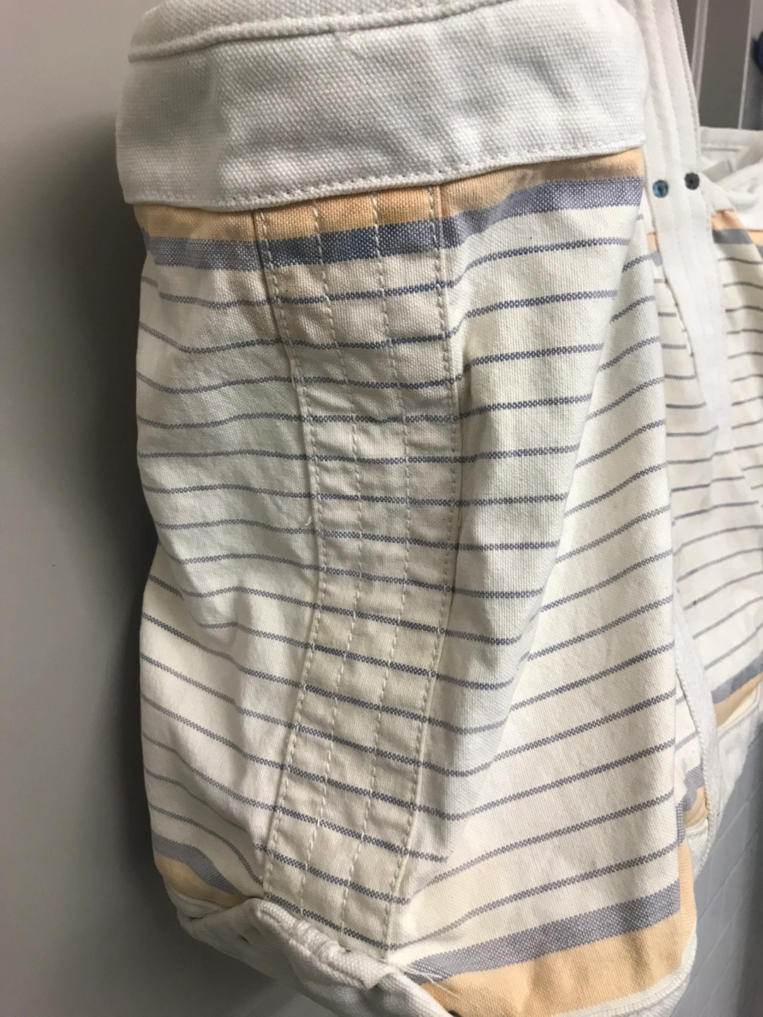 J Crew Heavy Duty XL Stripped Canvas Tote Bag. Although this vintage style bag is used, but overall still in excellent condition and great shape. Some signs of wear and slight stains, not so visible. Zipper functions and there are 2 pockets inside. From smoke pet free and healthy home.