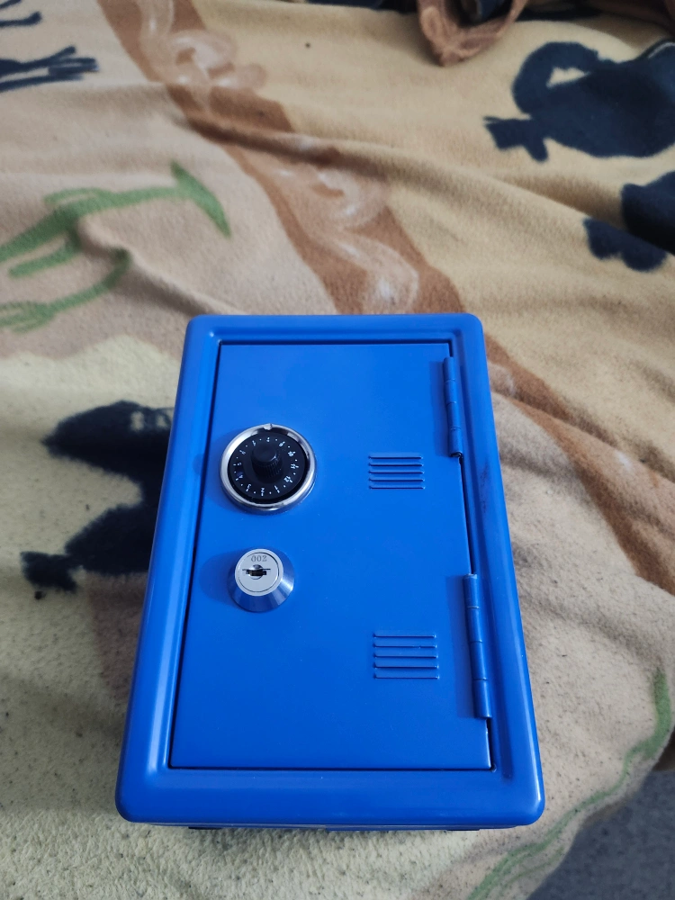 Here's a cute blue toy safe! It comes with a combination lock and a key, so it's perfect for storing little treasures. It's in great condition and ready for a new home piggybank
