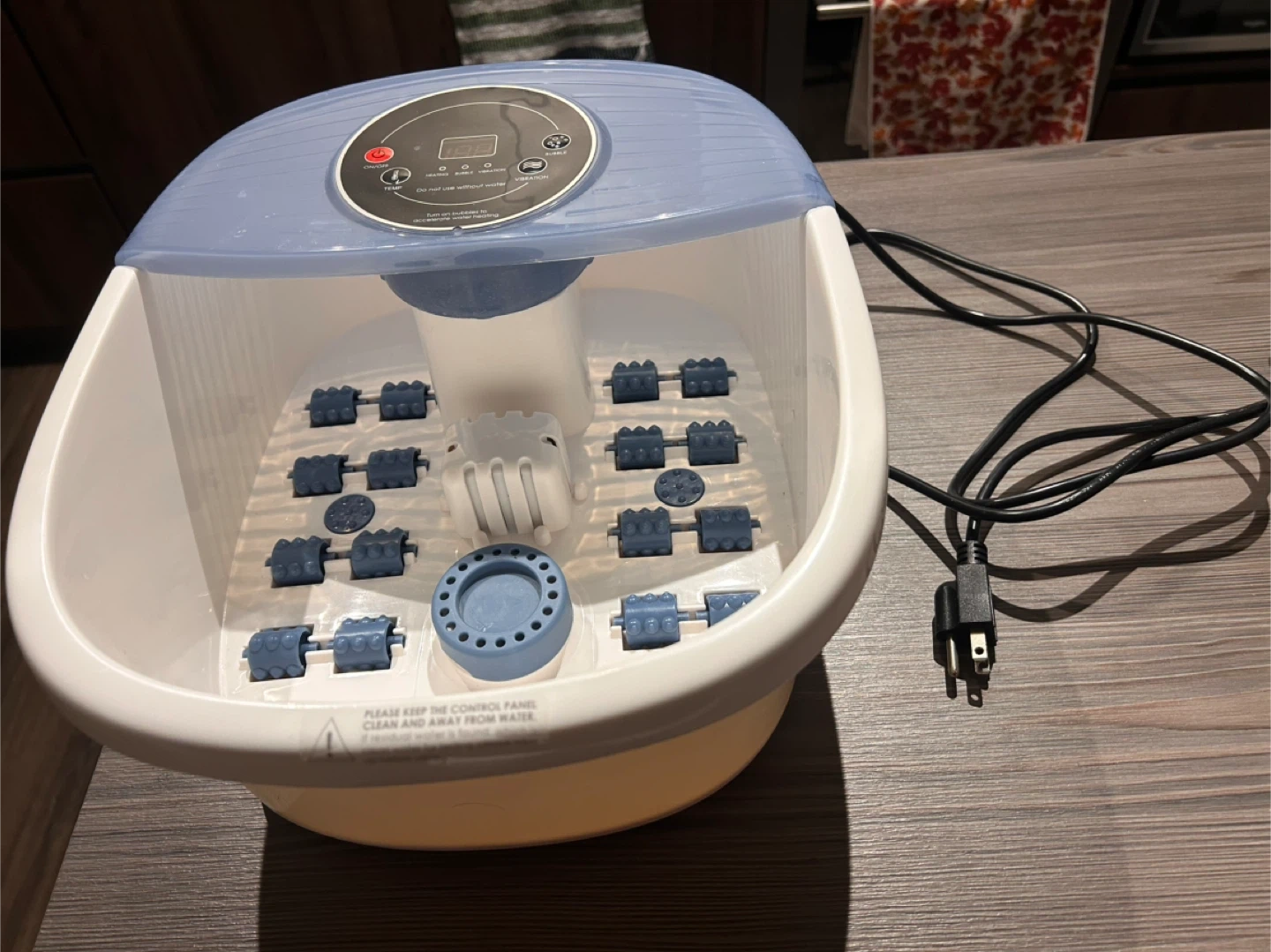 This foot spa bath features automatic massage rollers and vibration for a relaxing soak. It has a digital display and controls for temperature and timer settings. Bubble function available for enhanced comfort. Great for soothing tired feet after a long day!