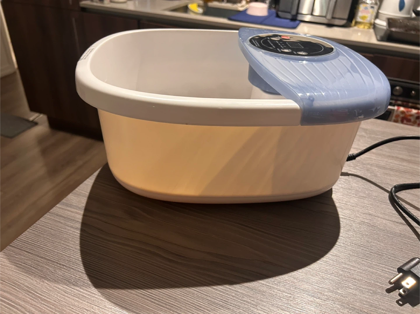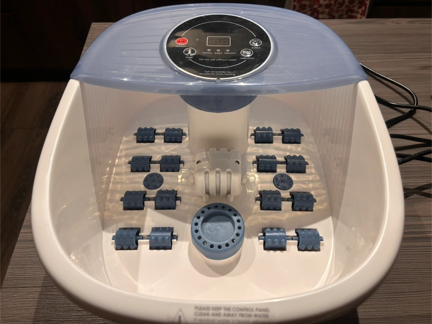 This foot spa bath features automatic massage rollers and vibration for a relaxing soak. It has a digital display and controls for temperature and timer settings. Bubble function available for enhanced comfort. Great for soothing tired feet after a long day!
