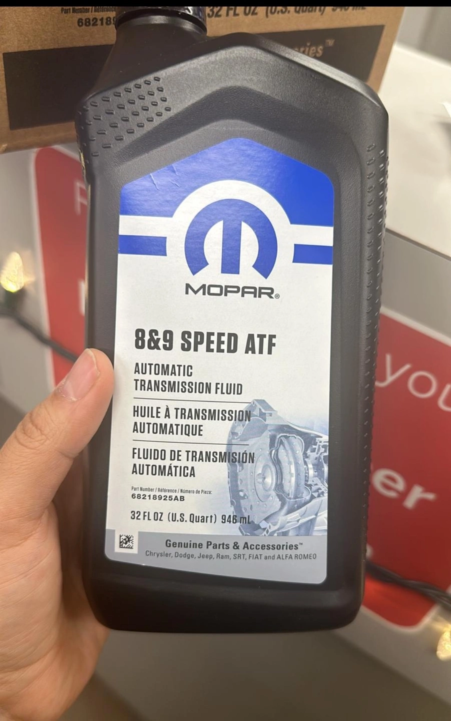 Six unopened bottles of Mopar 8 & 9 speed ATF automatic transmission fluid. New, unused, in original packaging. Part number 68218925AB. 32 fl oz (0.946 L) per bottle.