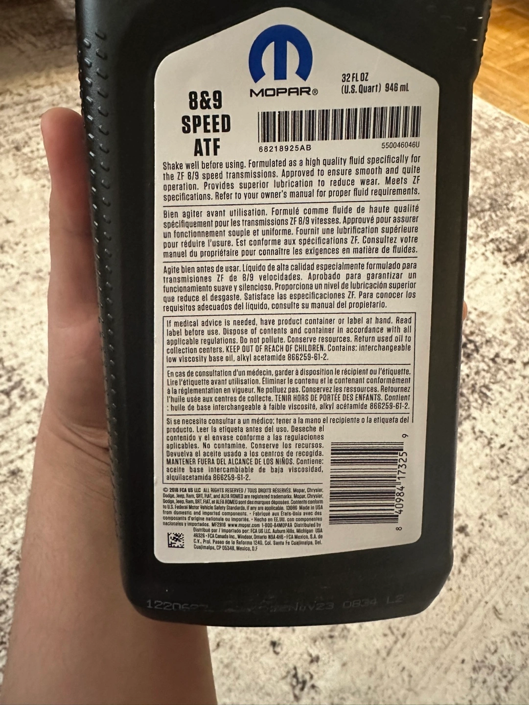 Six unopened bottles of Mopar 8 & 9 speed ATF automatic transmission fluid. New, unused, in original packaging. Part number 68218925AB. 32 fl oz (0.946 L) per bottle.