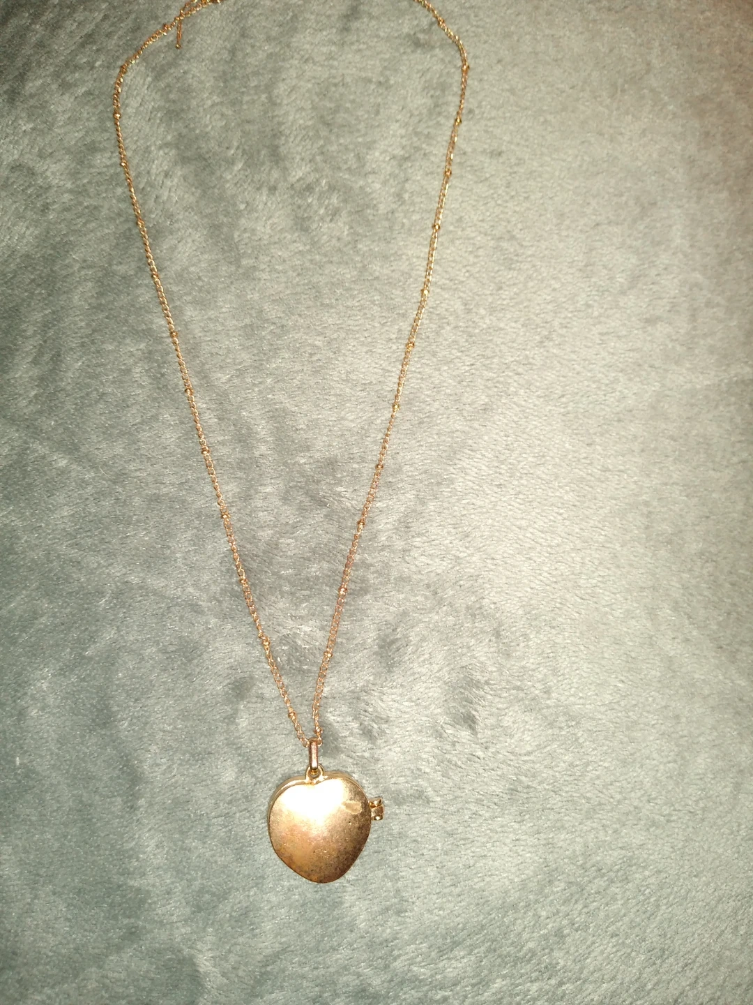 This is a very pretty gold chain and gold heart-shaped locket. It is called on one side and a pink stone on the other side. It is really lovely and very unique, it will make a great Christmas present for somebody on your list.