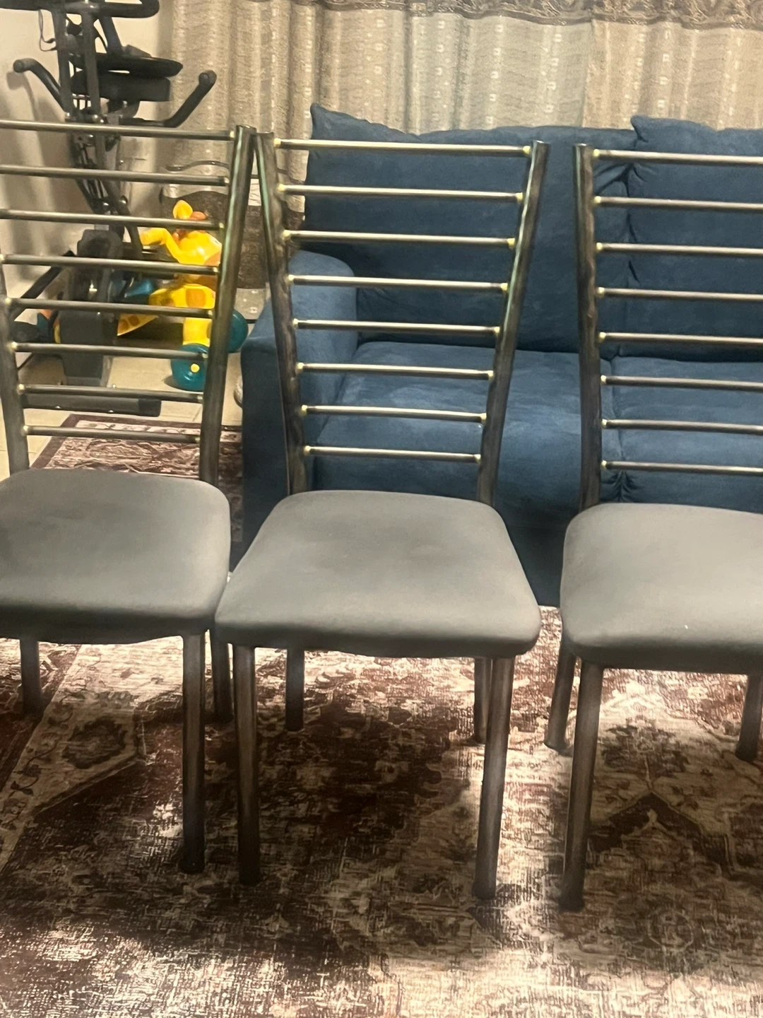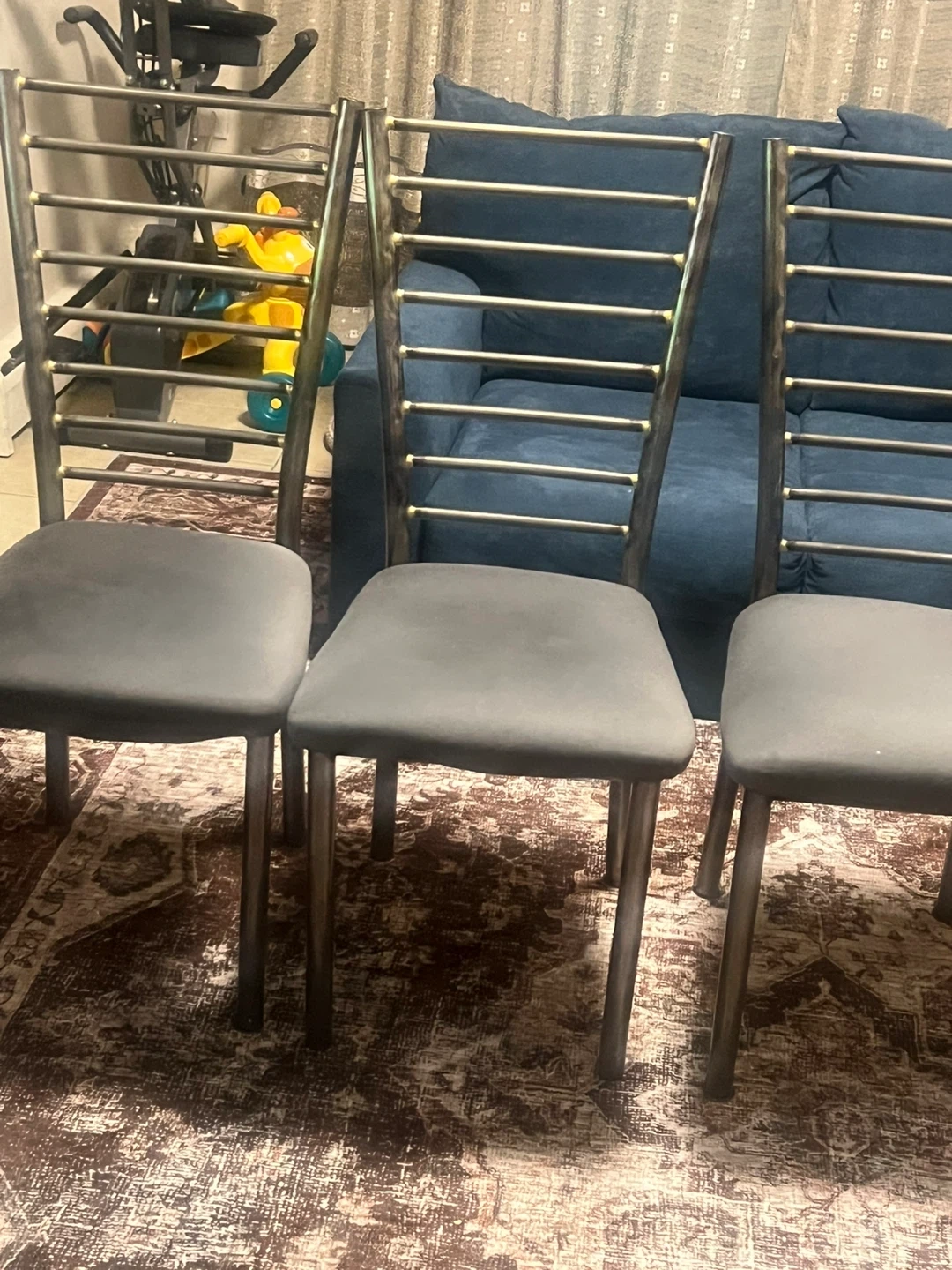 4 dining chairs with grey fabric seats and metal frames. The backrests are made of horizontal metal bars. These chairs offer a sleek, modern look for your dining space. Seats are upholstered for comfort.