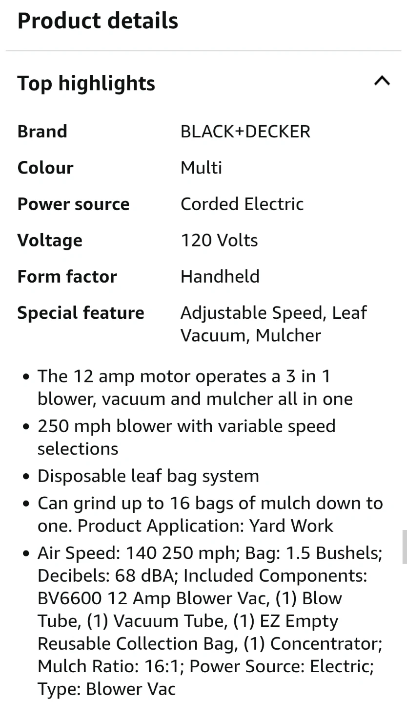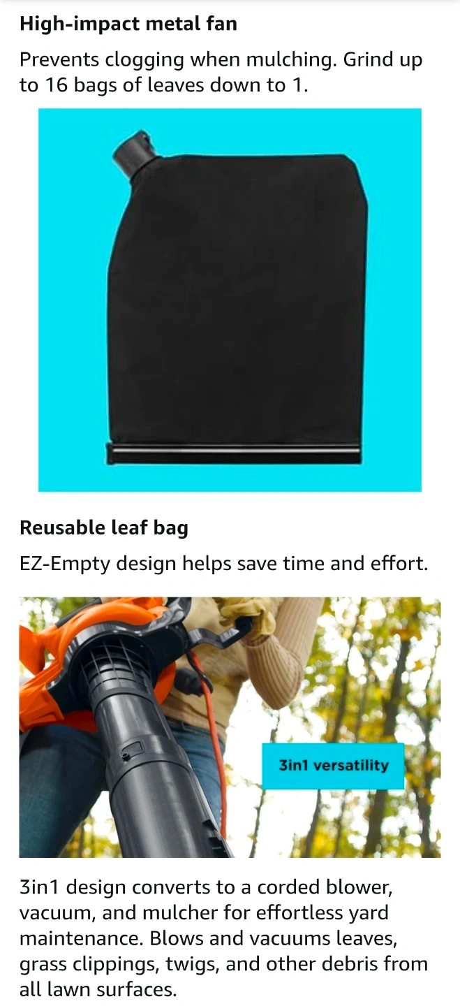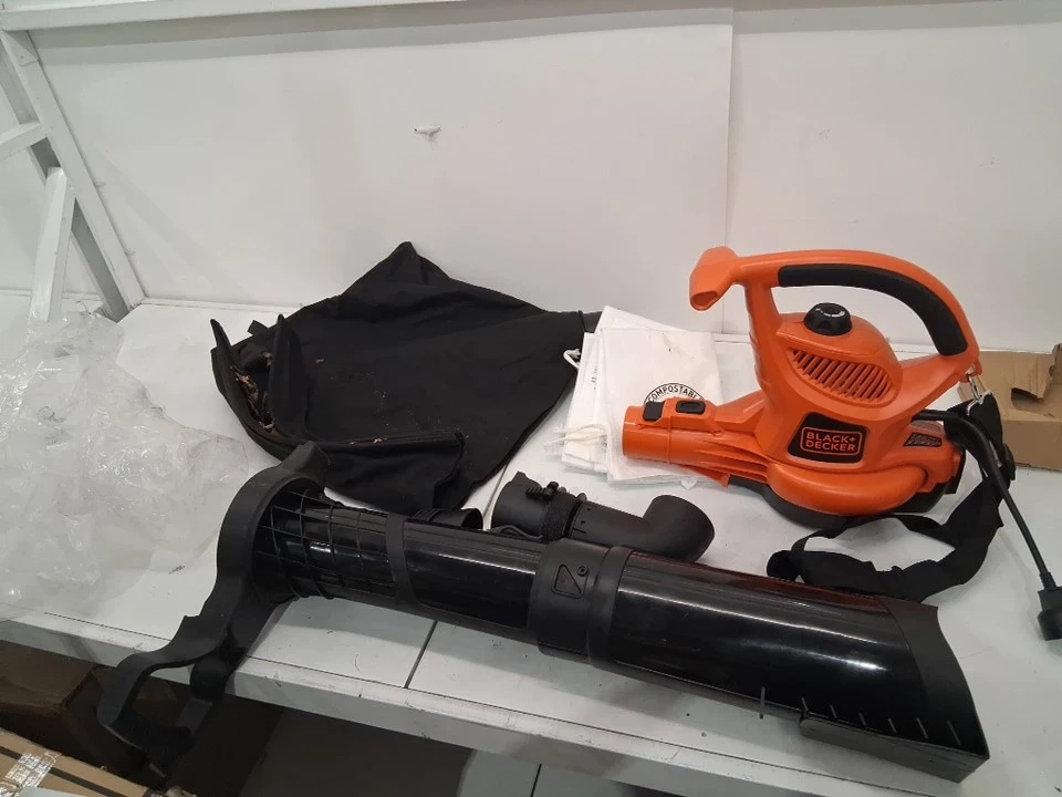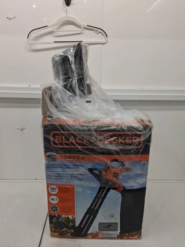 I'm selling a Black+Decker 3-in-1 electric leaf blower, leaf vacuum, and mulcher, perfect for keeping your yard tidy. This corded, 12-amp tool is in good condition, ready to tackle leaves, grass clippings, twigs, and other debris from all lawn surfaces. It has variable speed selections and easily converts from a blower to a vacuum to a mulcher. It also features a high-impact metal fan to prevent clogging when mulching, grinding up to 16 bags of leaves down to 1.