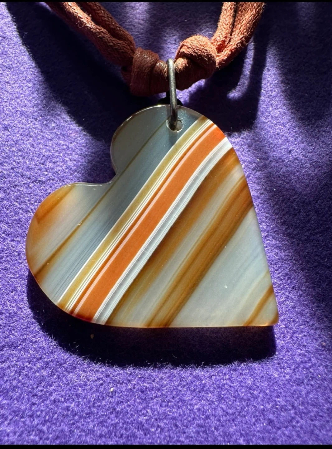 Heart-shaped necklace. Features a multi-strand brown cord and a unique striped heart in earthy tones. Simple, elegant design.