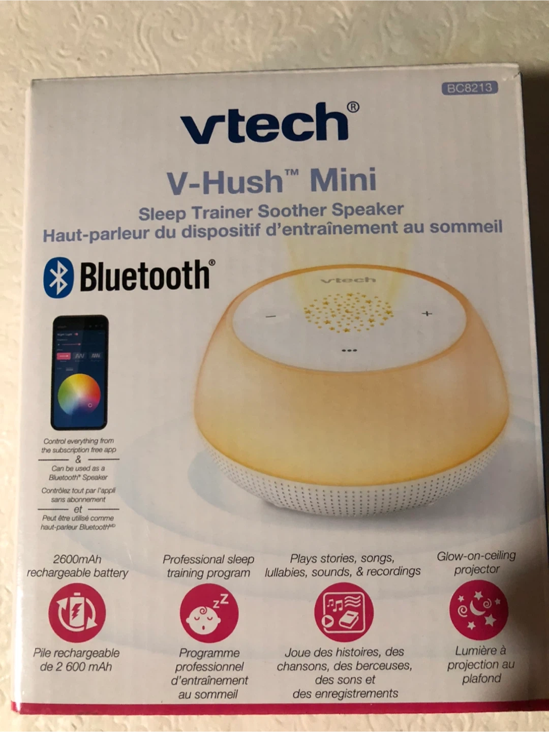 This VTech V-Hush Mini is a Bluetooth sleep trainer and soother speaker. It offers a professional sleep training program and a glow-on-ceiling projector. It plays stories, songs, lullabies, sounds, and recordings. The device has a 2600mAh rechargeable battery.