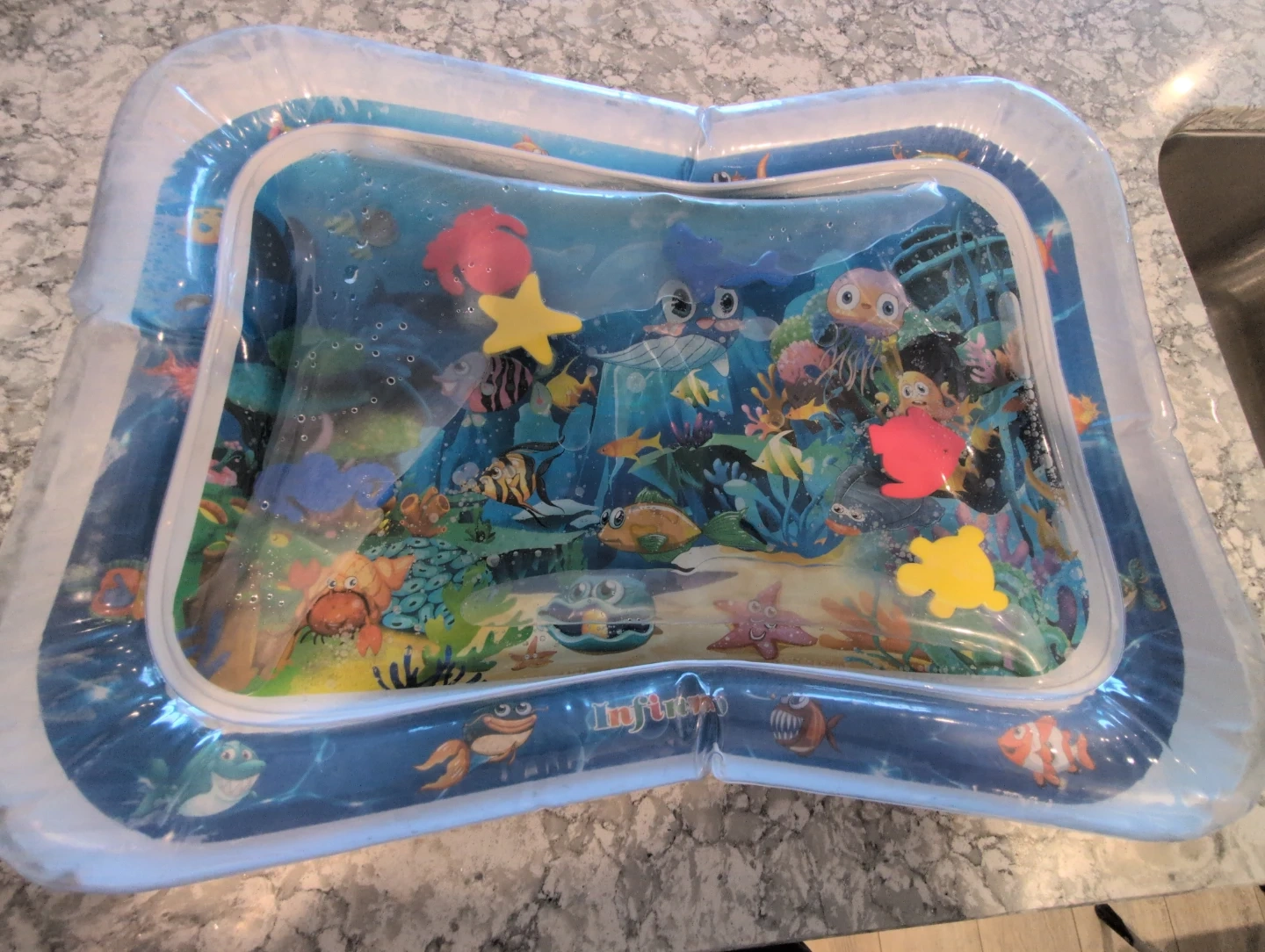 Infunbebe water play mat with a cute underwater theme! It's filled with foam toys that float and move when the mat is filled with water. This mat helps babies develop motor skills and sensory exploration. Great for tummy time fun! No leaks, smoke free home