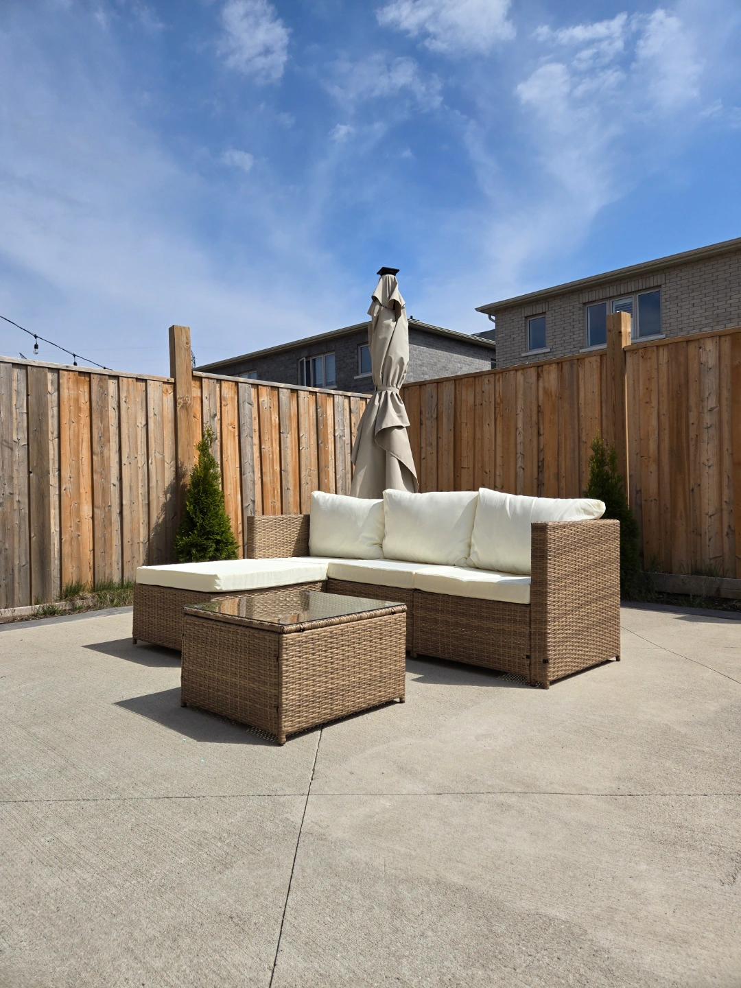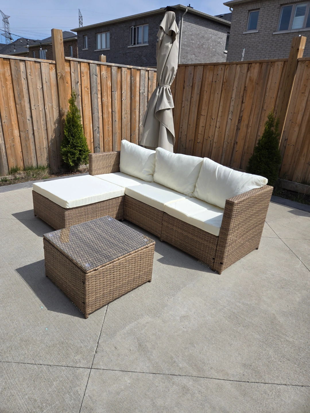 Brown wicker patio furniture. Includes sectional sofa, chaise lounge, and coffee table with glass top. Off-white cushions. Great for relaxing outdoors.