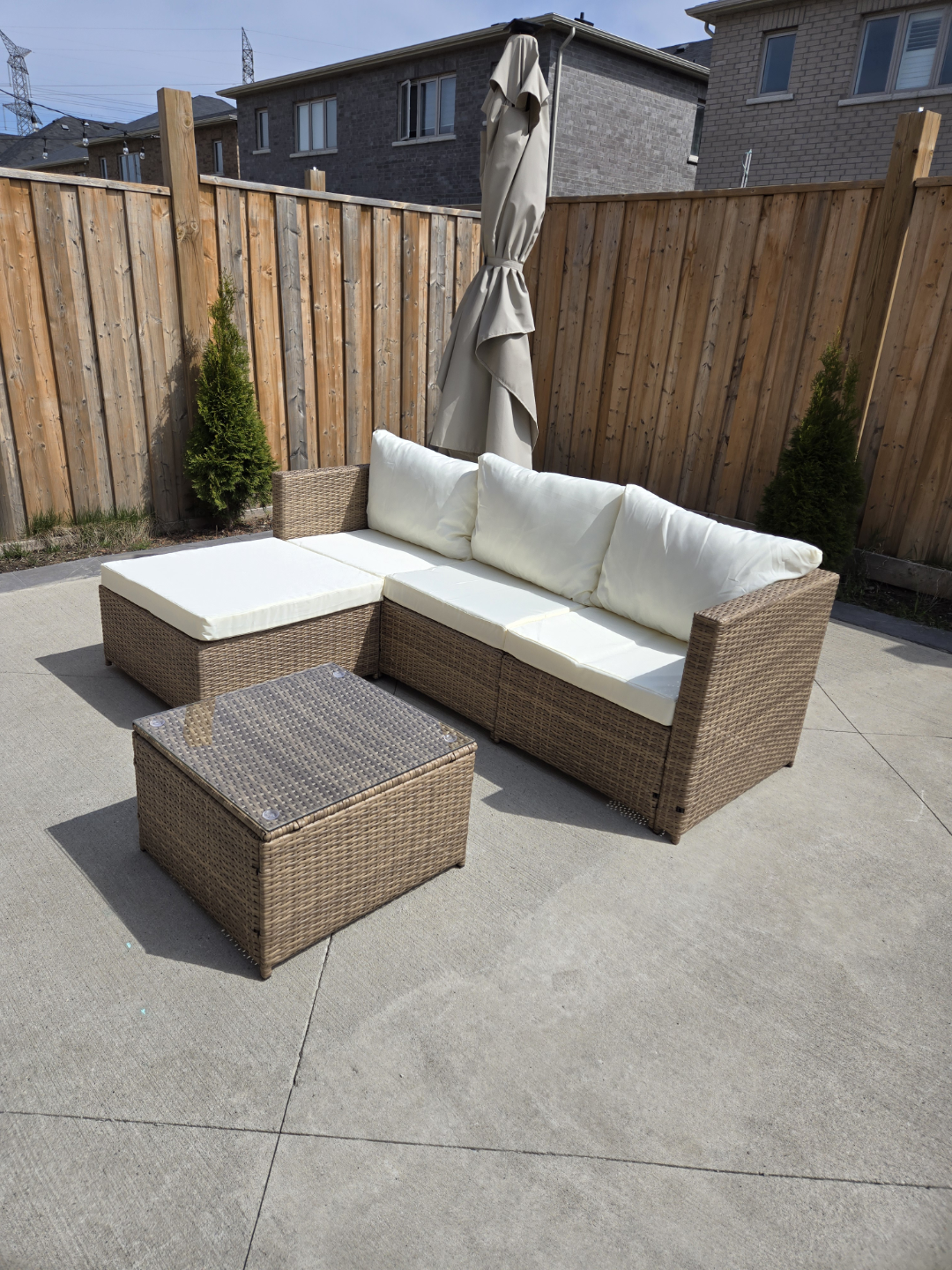 Brown wicker patio furniture. Includes sectional sofa, chaise lounge, and coffee table with glass top. Off-white cushions. Great for relaxing outdoors.