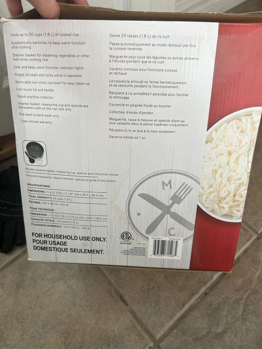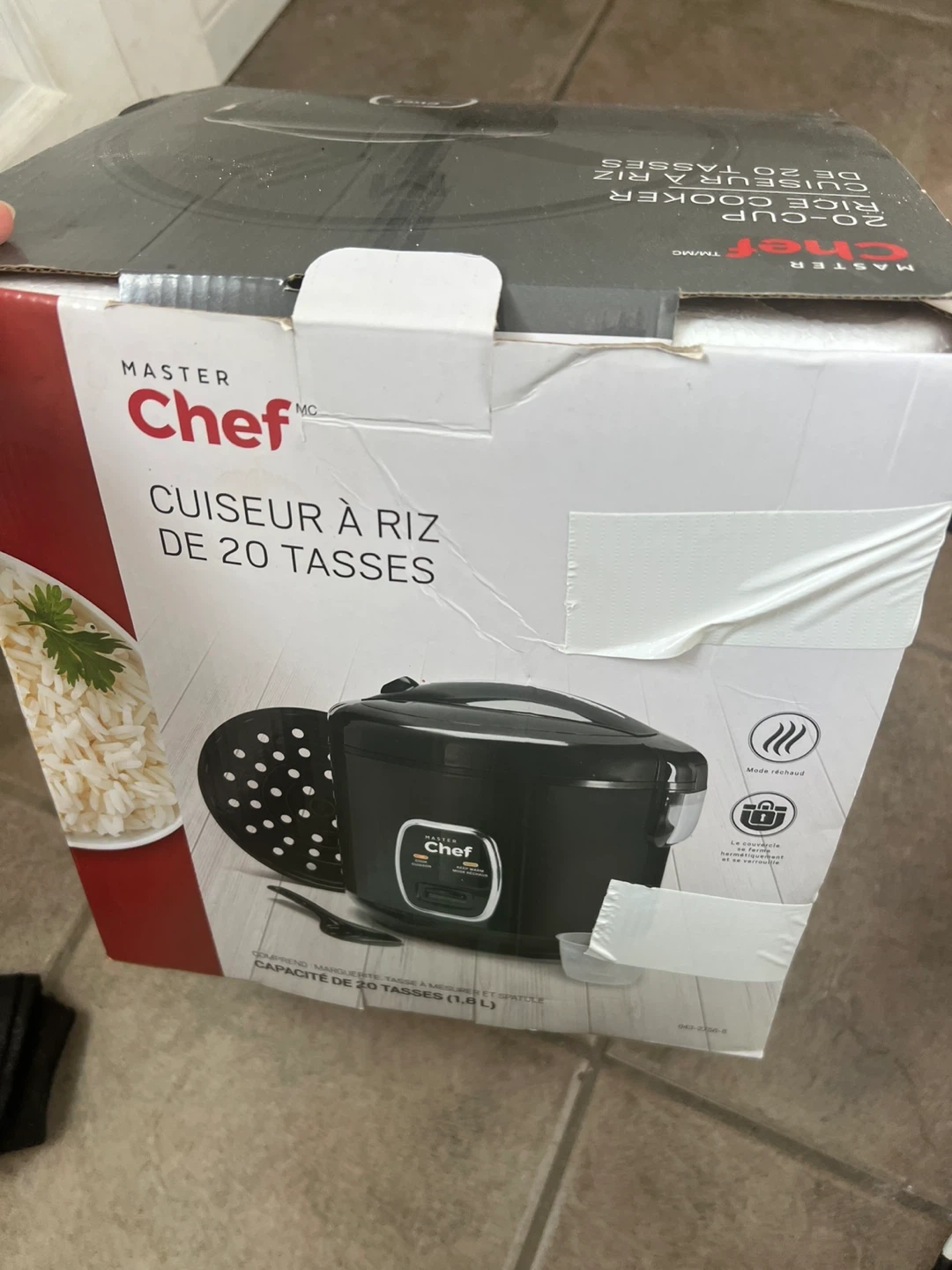 This Master Chef rice cooker yields up to 20 cups (1.8 L) of cooked rice. It features a steamer basket, measuring cup, spatula, and instruction manual. The rice bowl is hand wash only.