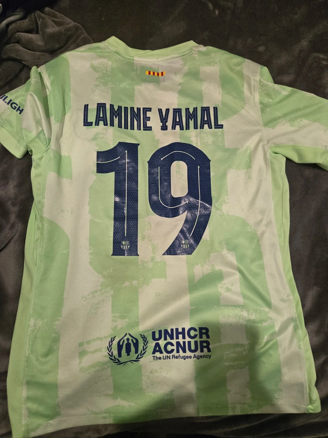 This brand new Lamine Yamal #19 FC Barcelona home soccer jersey for the 2024/25 season is a must-have for any fan. Featuring the iconic Blaugrana colours and the official club crest, this jersey is perfect for showing your support on and off the pitch.
