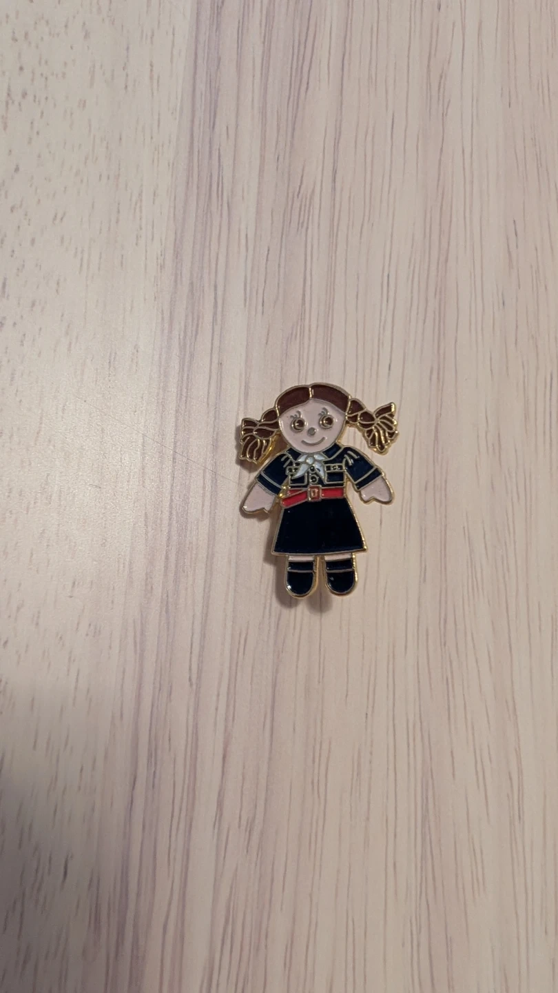 This is a cute doll-shaped enamel pin. It features pigtails and a dark blue dress with a red belt. The pin has a secure clasp on the back for easy attachment.