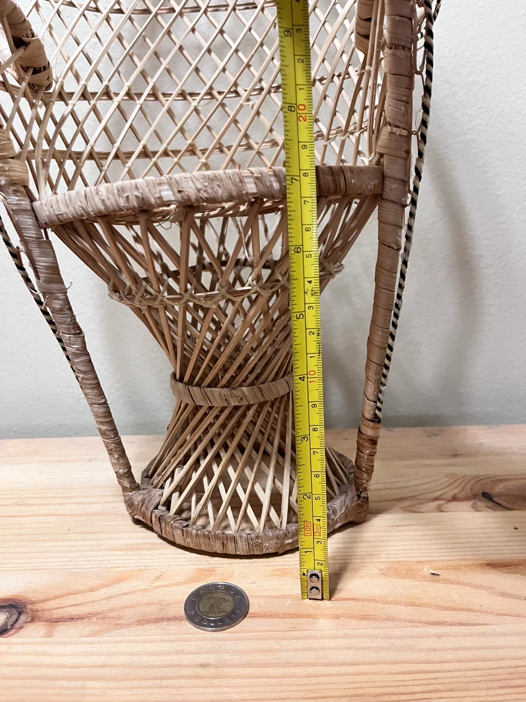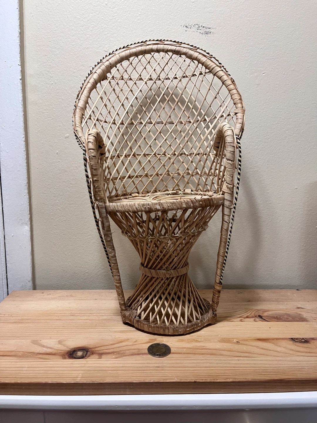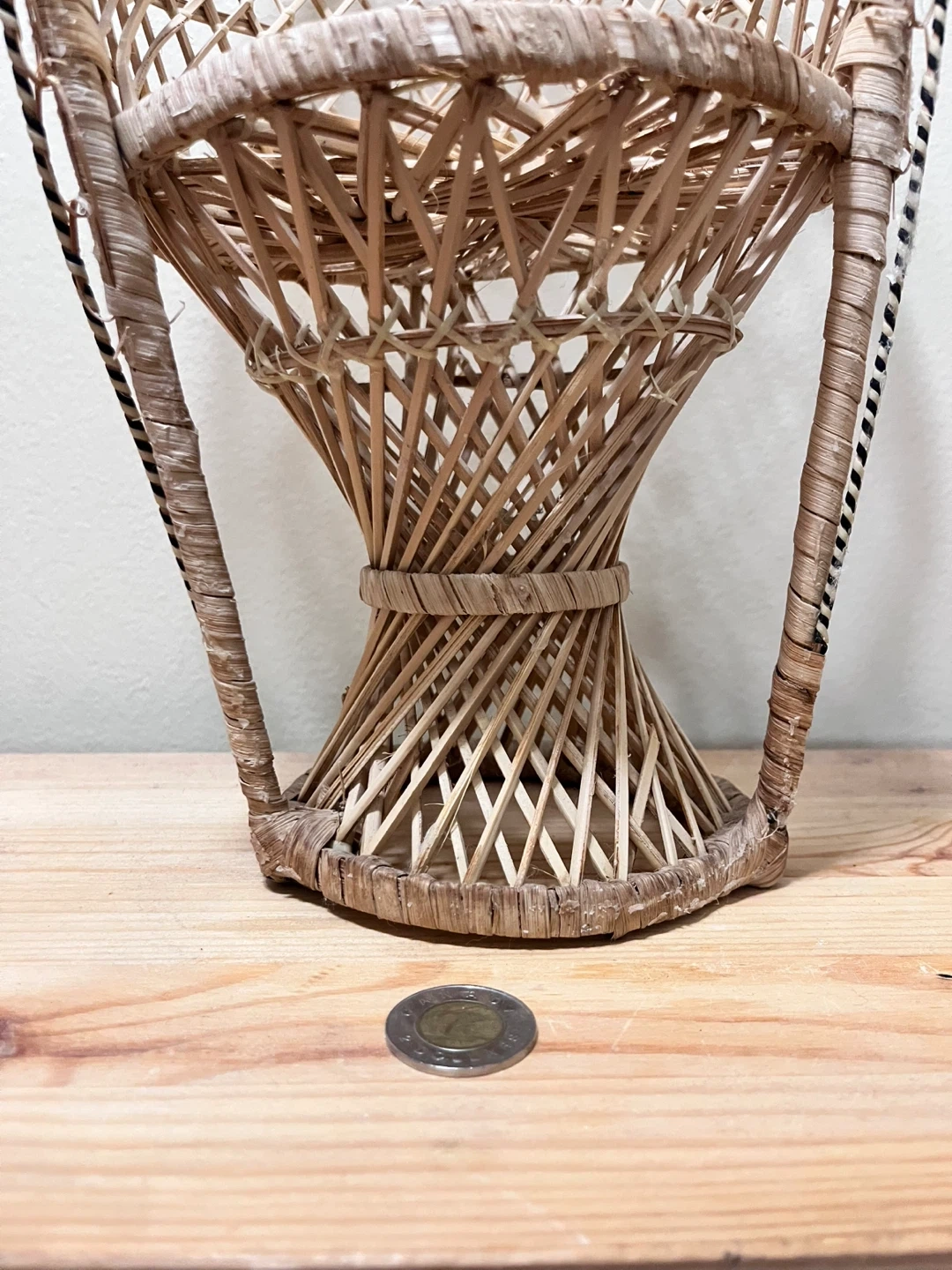 This cute miniature wicker peacock chair is meant to be a plant or pot stand, but could be used to display other items. It sits a little uneven as you can see from the photos, and it has some wear and tear.