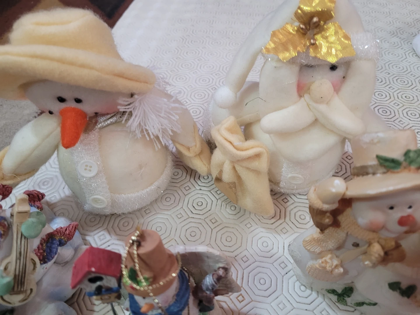 Collection of festive snowman figurines for holiday decor. Features various designs and outfits, perfect for adding a touch of winter whimsy to your home. Made from fabric and resin materials.