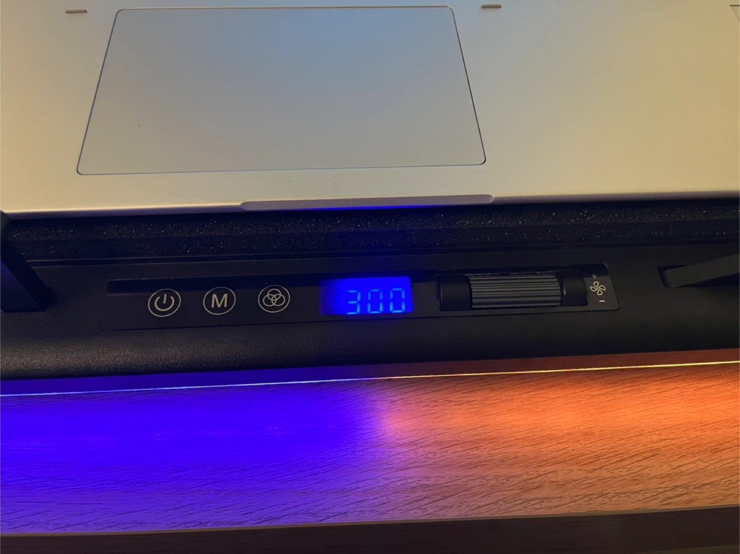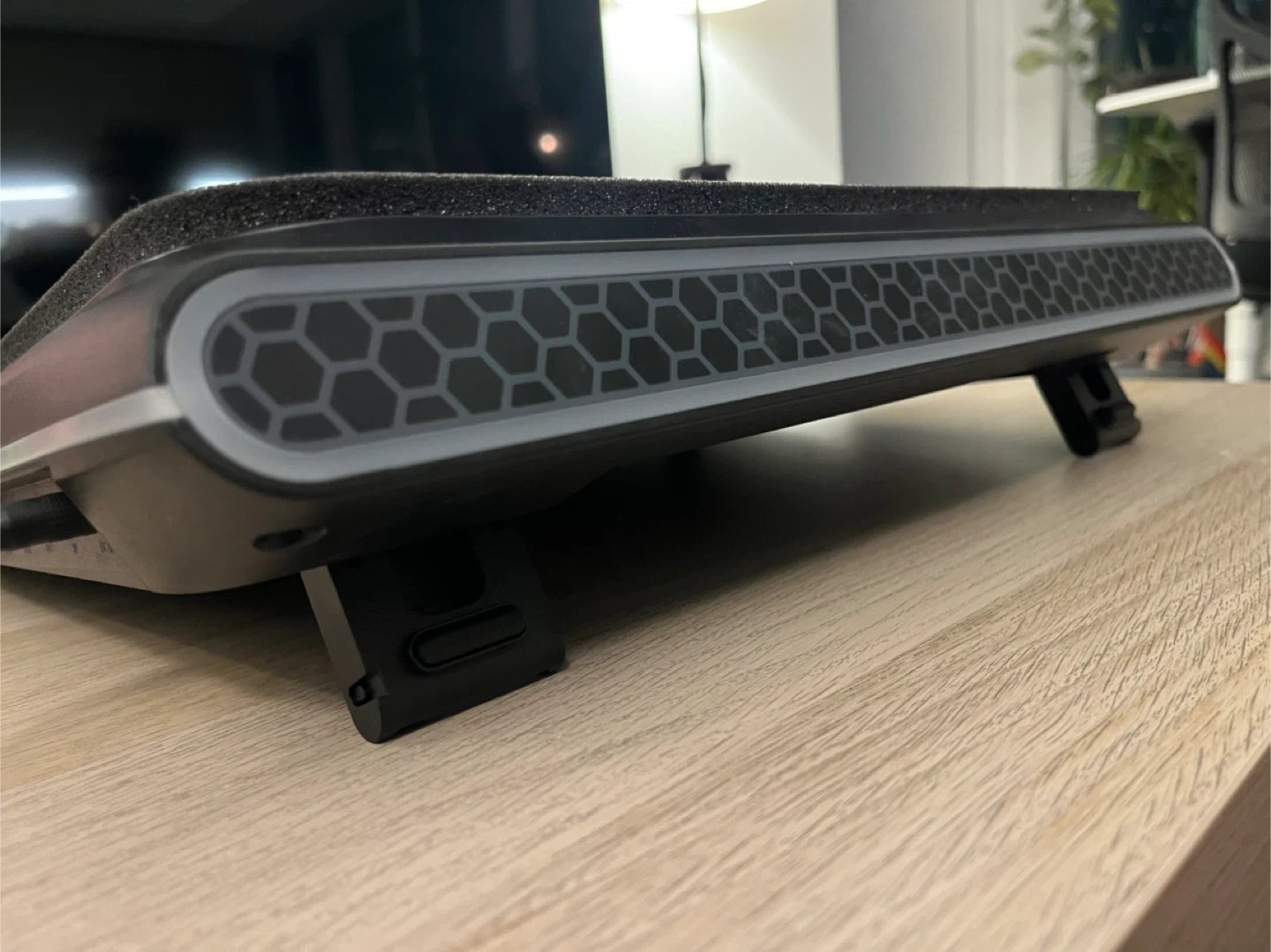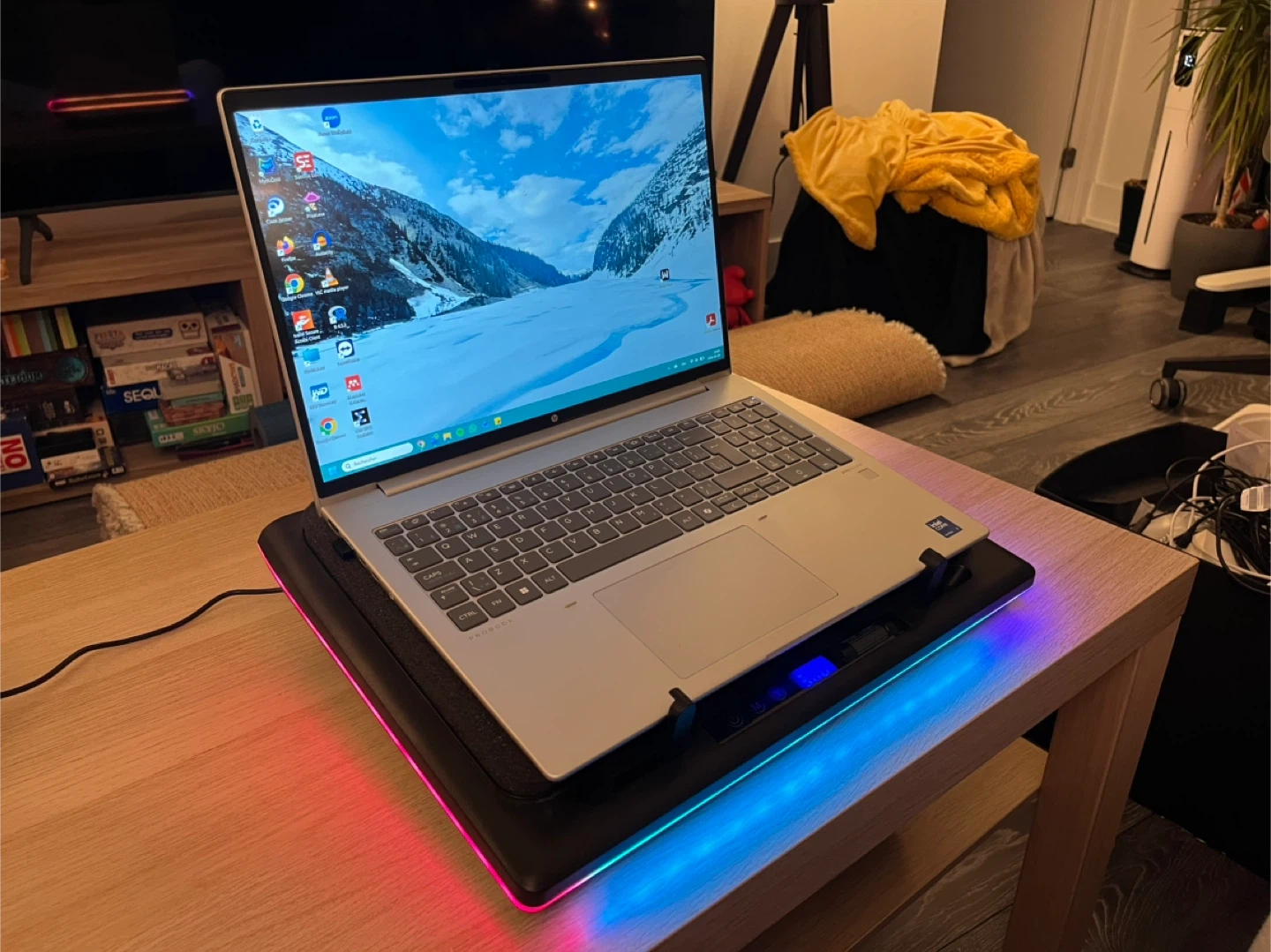 The Llano V12 laptop cooling pad features adjustable fan speed and customizable RGB lighting. It has multiple USB ports for connectivity.