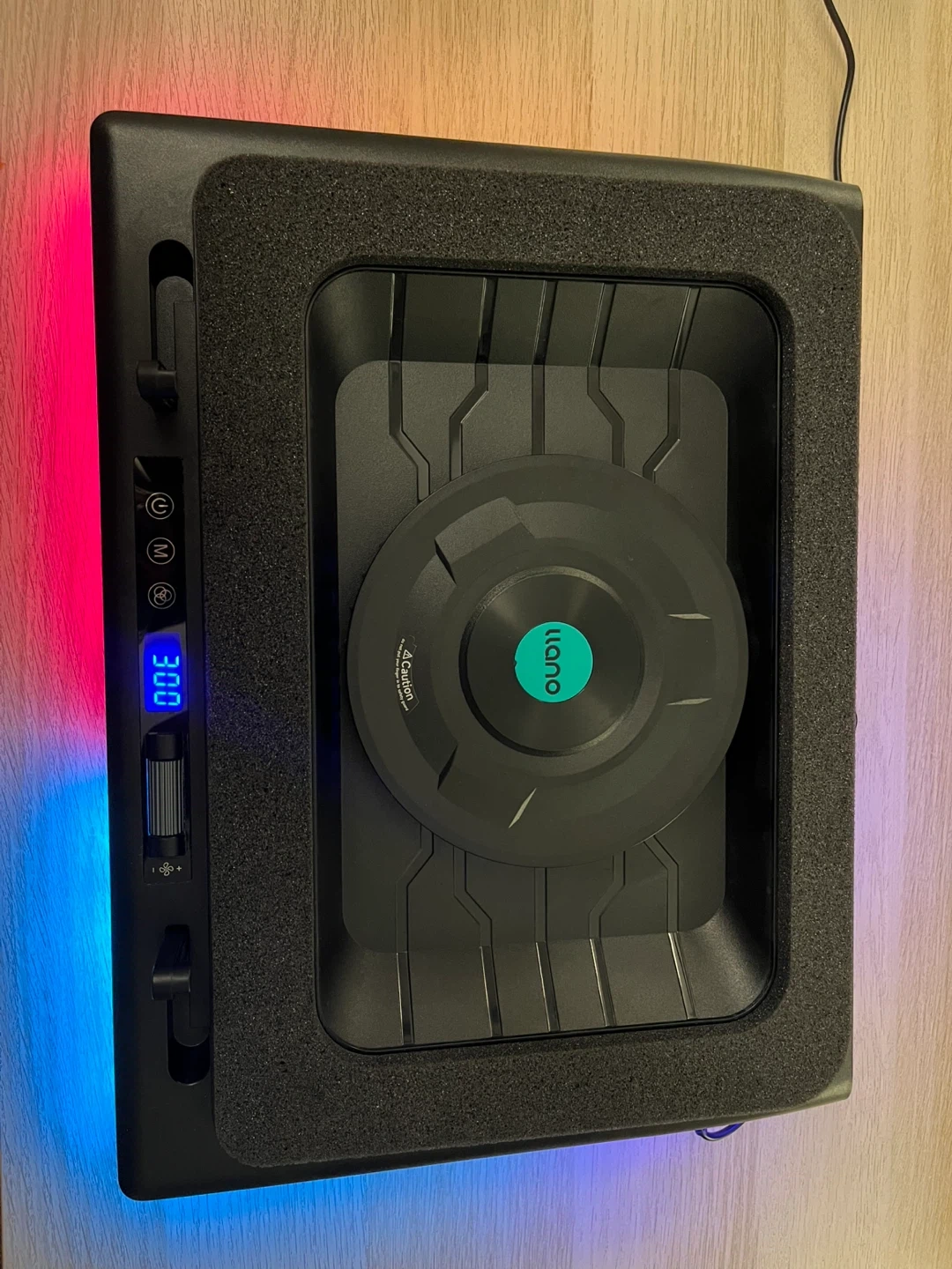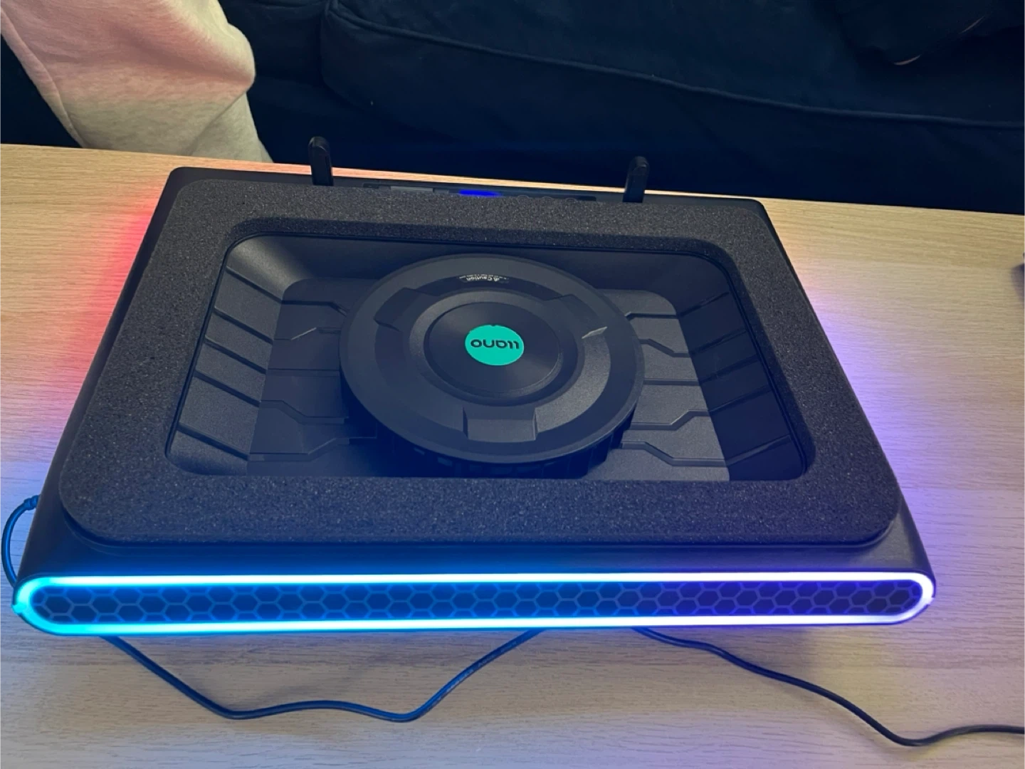The Llano V12 laptop cooling pad features adjustable fan speed and customizable RGB lighting. It has multiple USB ports for connectivity.