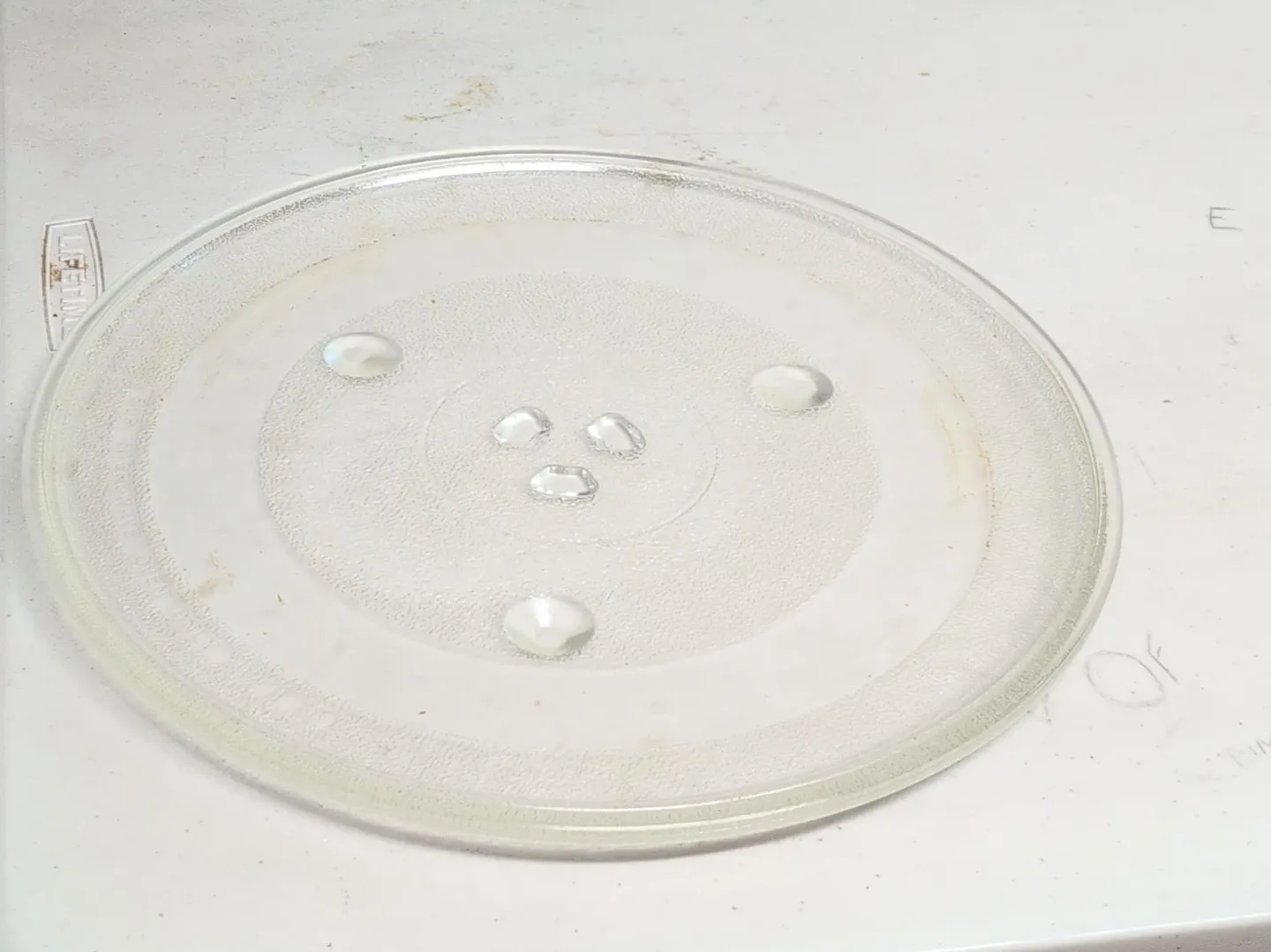 This is a round glass turntable plate for microwaves. It's made of clear glass and has a textured surface with a central ring for stability. The plate measures 10.5 inches in diameter. It's a replacement part for many microwave models.