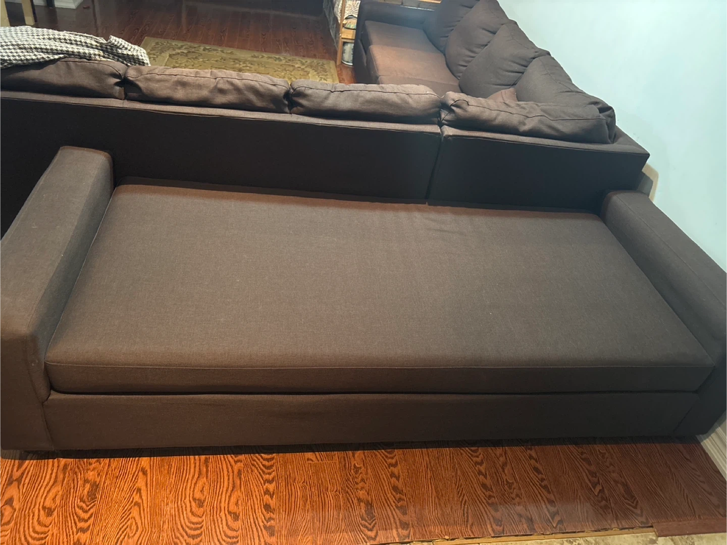 This dark brown sectional sofa features a chaise lounge, perfect for extra seating or stretching out. It's upholstered in a durable fabric. This sofa provides ample space for lounging in your living room.