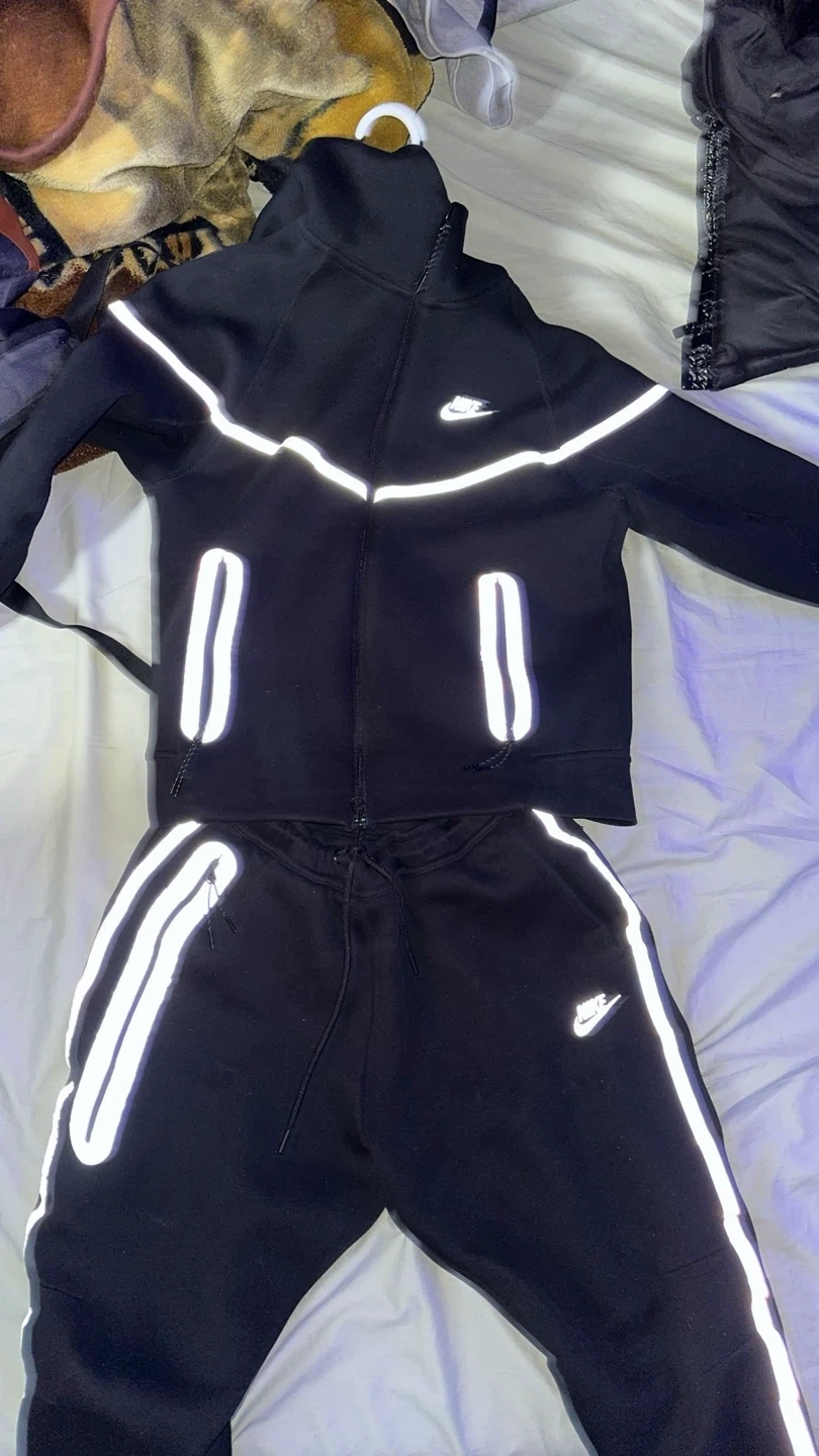 This is a black Nike Tech Fleece tracksuit reflective in kids size large fit like mens small . It's made with a comfortable blend and features reflective detailing. It's great for casual wear or athletic activities.