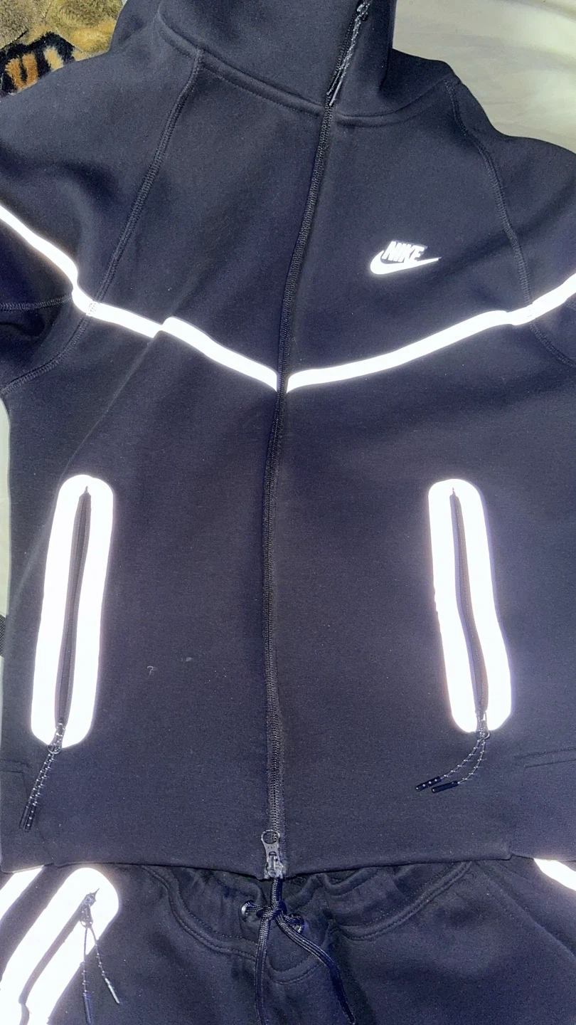 This is a black Nike Tech Fleece tracksuit reflective in kids size large fit like mens small . It's made with a comfortable blend and features reflective detailing. It's great for casual wear or athletic activities.