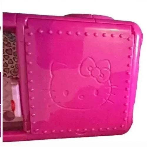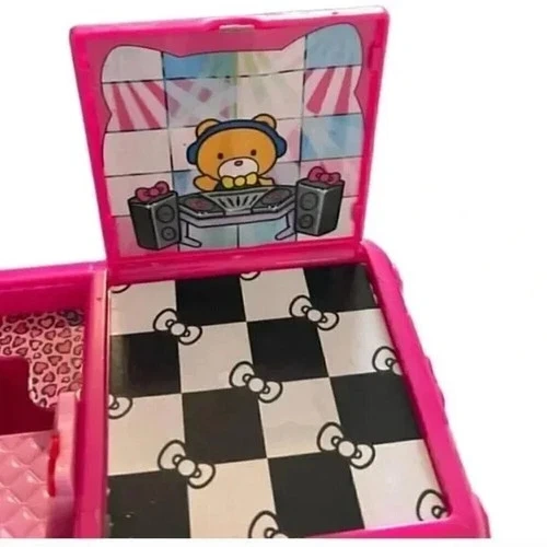 Adorable vintage Hello Kitty pink collectible car featuring classic Sanrio graphics and charming interior details. This iconic piece showcases Hello Kitty styling throughout, including printed seats, cute accents, and a fold-open back that reveals a fun dance floor / DJ scene—perfect for display or imaginative play. A must-have for Hello Kitty collectors, Sanrio fans, or anyone who loves nostalgic Y2K toys. Harder to find and full of character, this piece makes a great shelf display or addition to a curated collection.