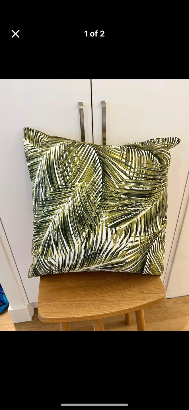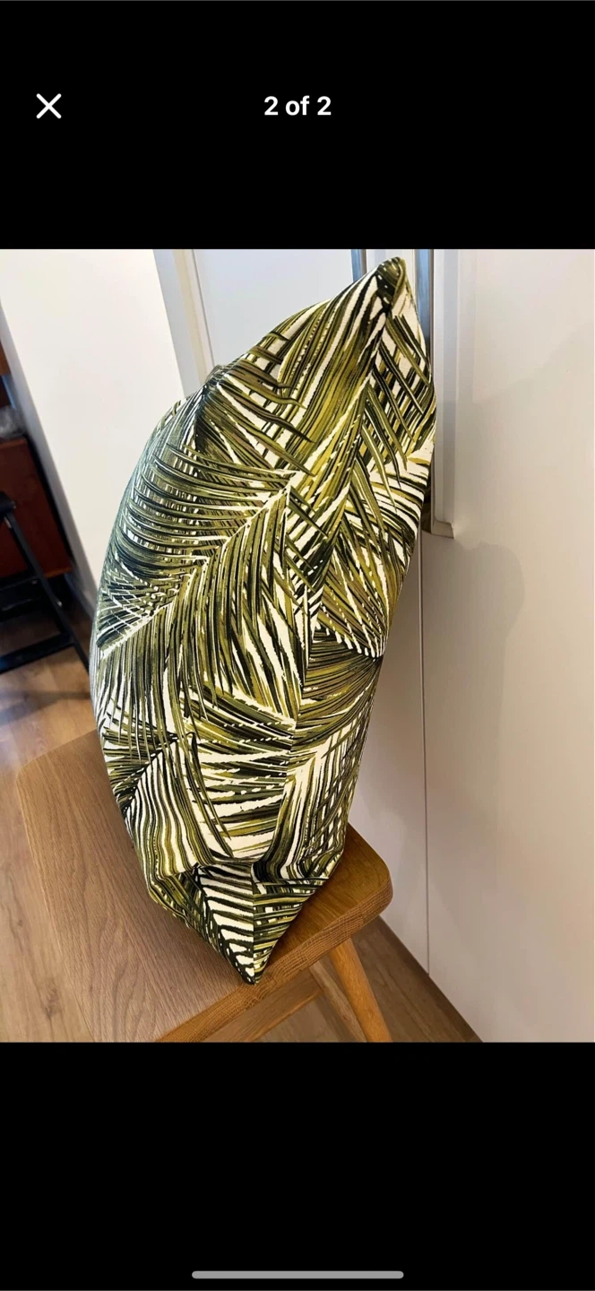 A stylish throw pillow with a vibrant green leaf pattern! It's in great condition and would look lovely on a couch or bed. The pillow is down-filled and has a unique design that will add a touch of nature to your home decor.