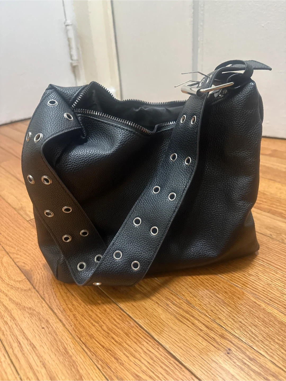 It features a unique grommet design on the strap and body of the bag. Perfect for adding a bit of edge to any outfit