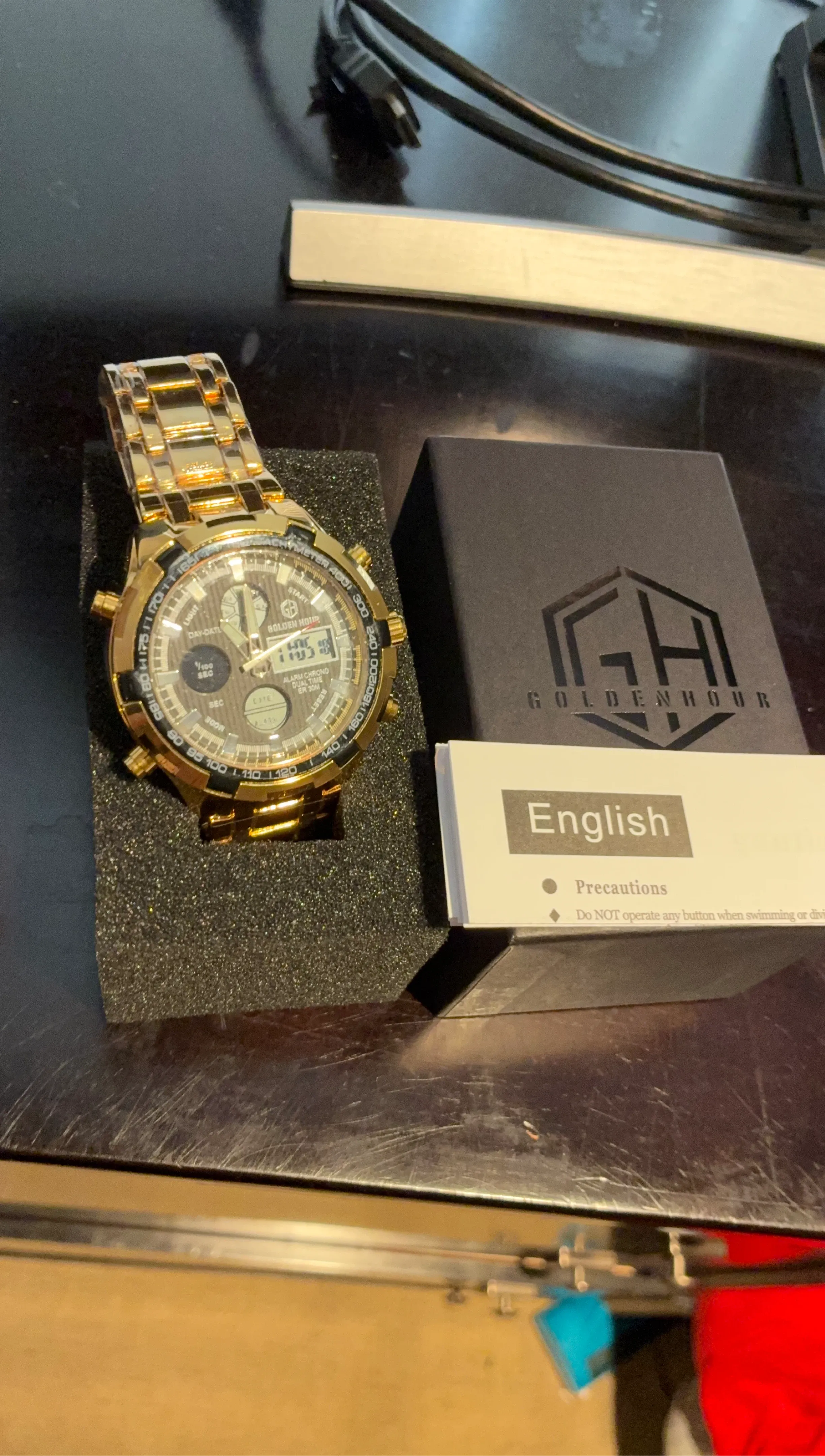 This Goldenhour watch features a gold-tone metal bracelet and a dual display. It has an alarm, chrono, and dual time function. Water resistant to 30 meters.
