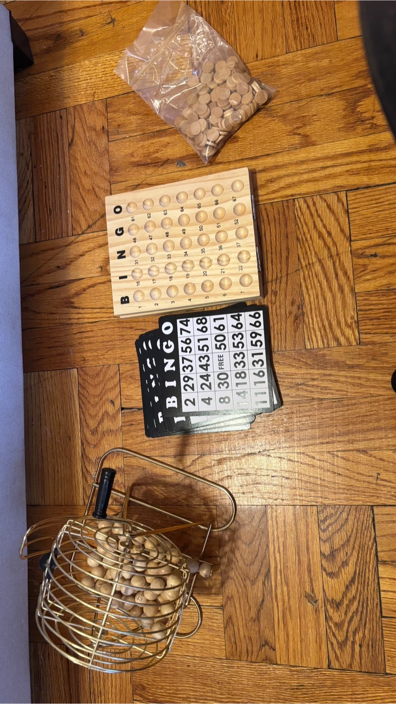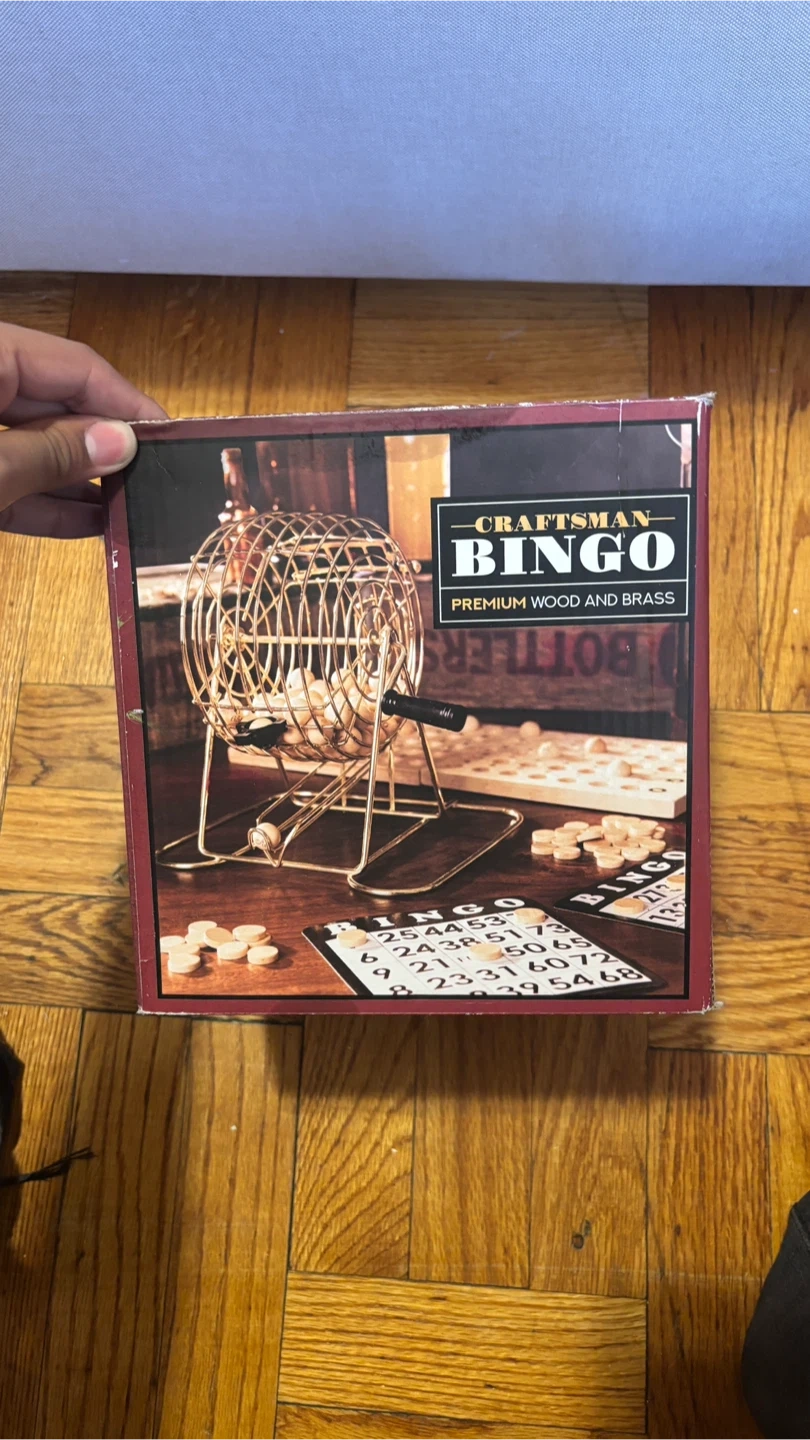 Selling a Craftsman Bingo game, made with premium wood and brass. It includes the bingo cards, wooden bingo chips, the bingo board, and the bingo cage. The original box is also included although it’s partially damaged.
