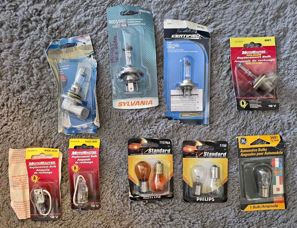 Assorted automotive bulbs: 3297 (12V - 1 bulb), Phillips Standard 1156 (12V - 2 bulbs), Phillips Standard 1157NA (12V - 2 bulbs), Motomaster halogen 881 (12V - 1 bulb), Motomaster h3-55 (12V - 2 bulbs), Phillips Halogen Vision 9006BV Bluevision (1 bulb), Sylvania 9003/HB2/H4 (1 bulb). $5 each, willing to do a deal for multiple bulbs.