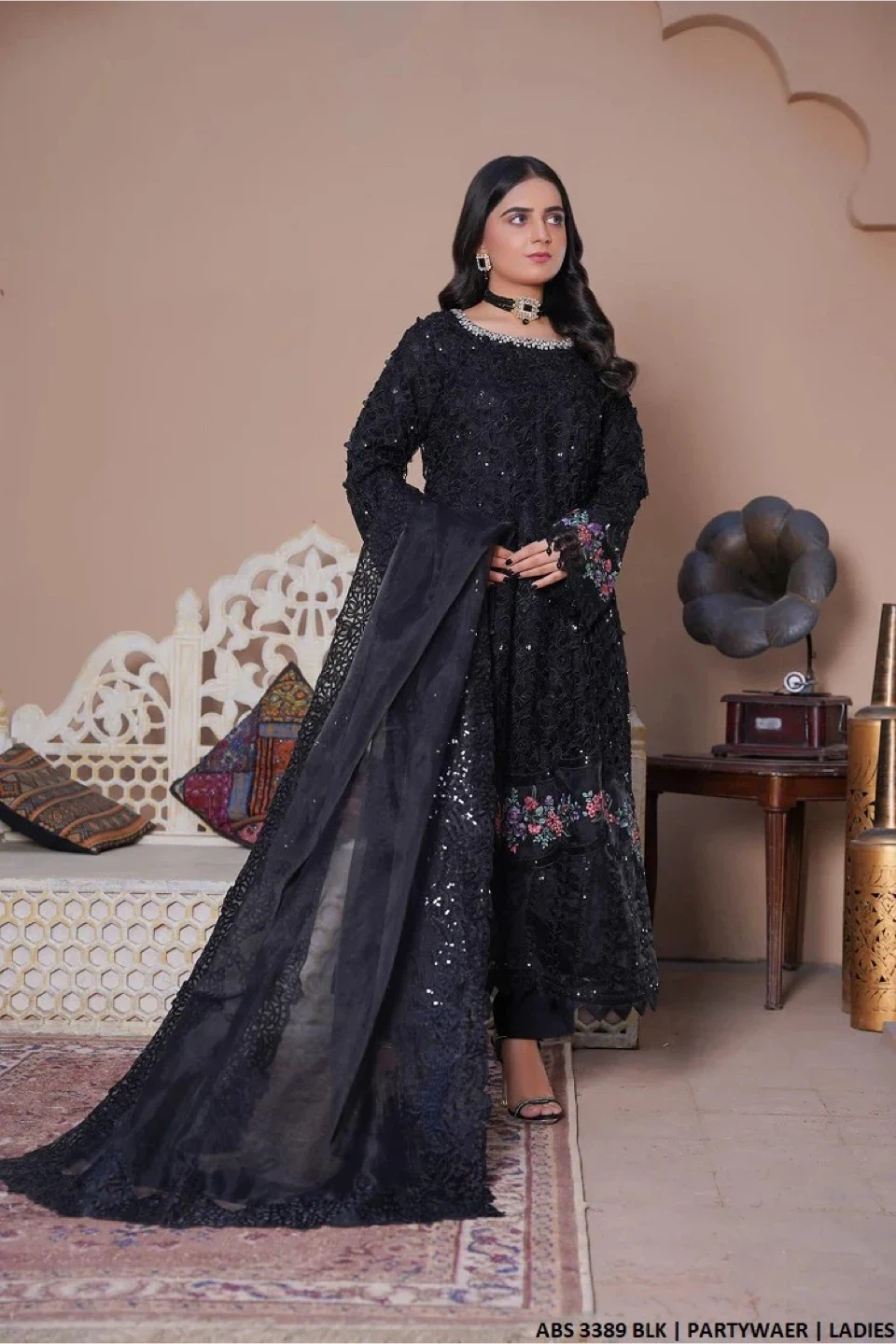 This is a black party wear dress with intricate embroidery and sequin details. It includes a matching dupatta. The fabric appears to be a fine net or lace with floral accents on the sleeves and hem.