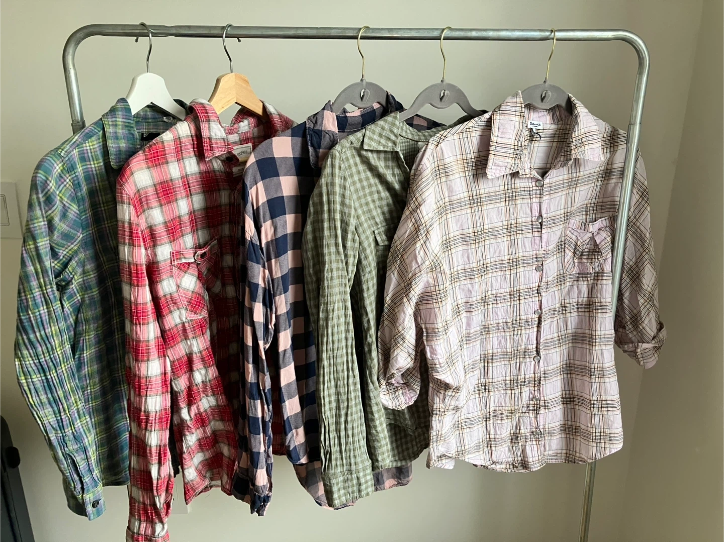 Colorful collection of plaid button down shirts. Five shirts total, great for layering or casual wear. Almost all 100% cotton (except for purple one), size small (pink one is XS but fits super oversized). Will also sell individually and can send more pictures.