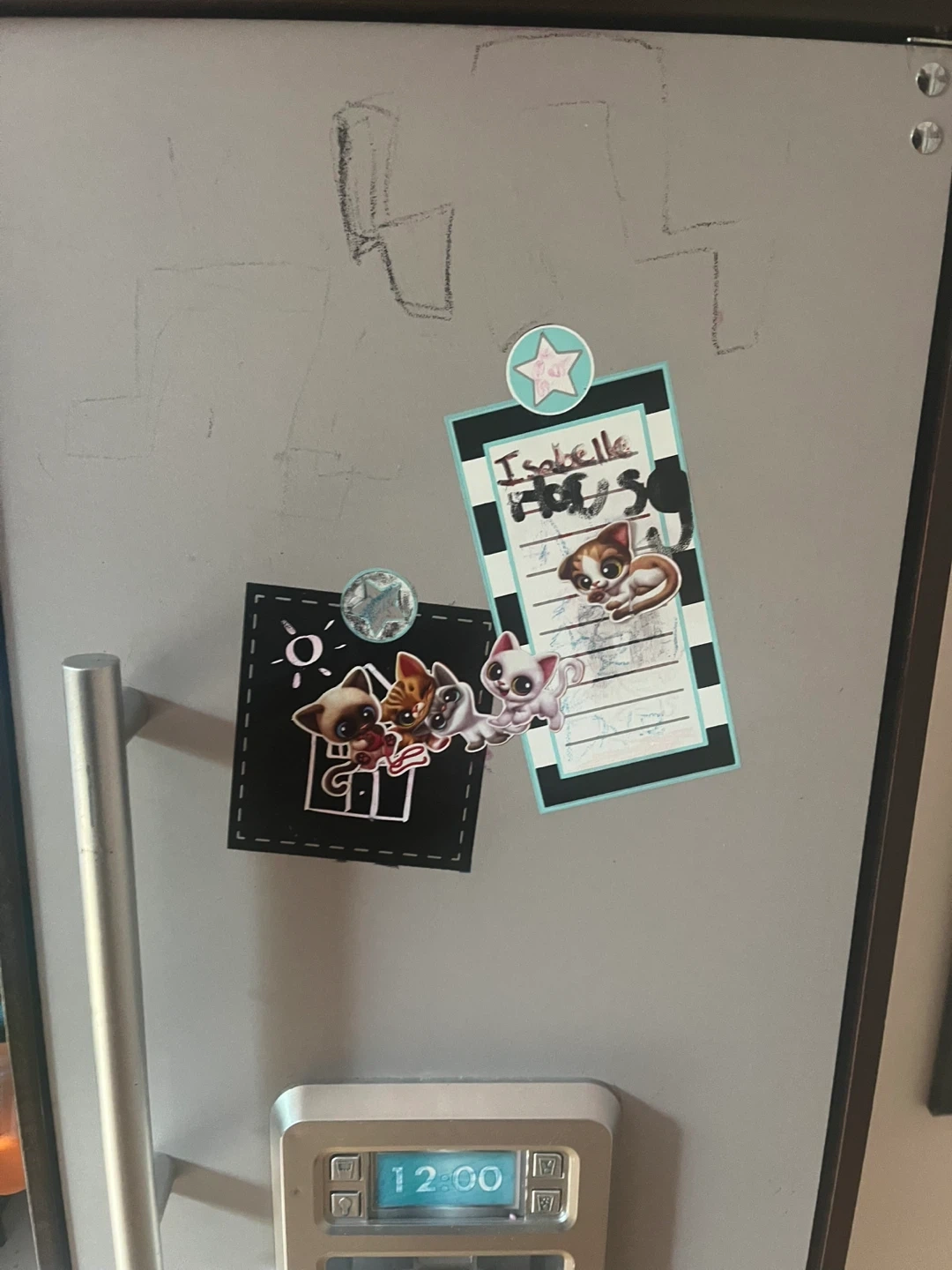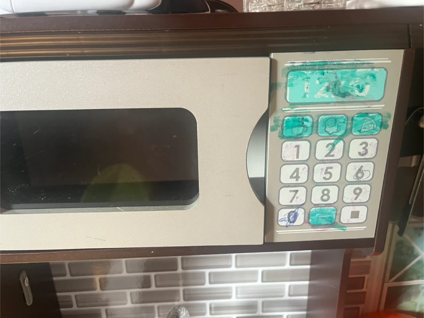 Selling a KidKraft wooden play kitchen. It comes with a basket full of play food and accessories. There are some signs of use, including some marks on the microwave panel and some drawings on the refrigerator door. Still lots of fun left!