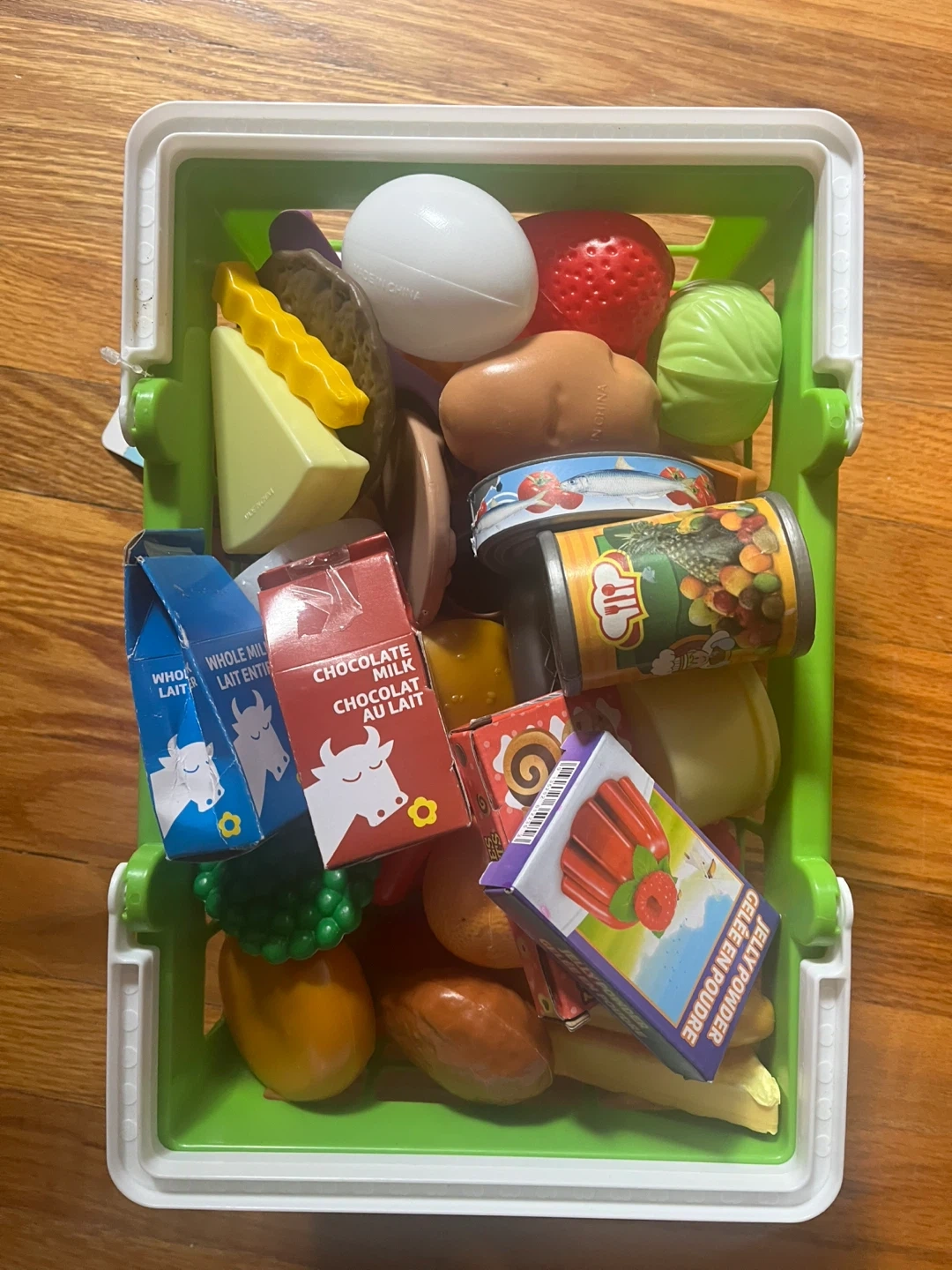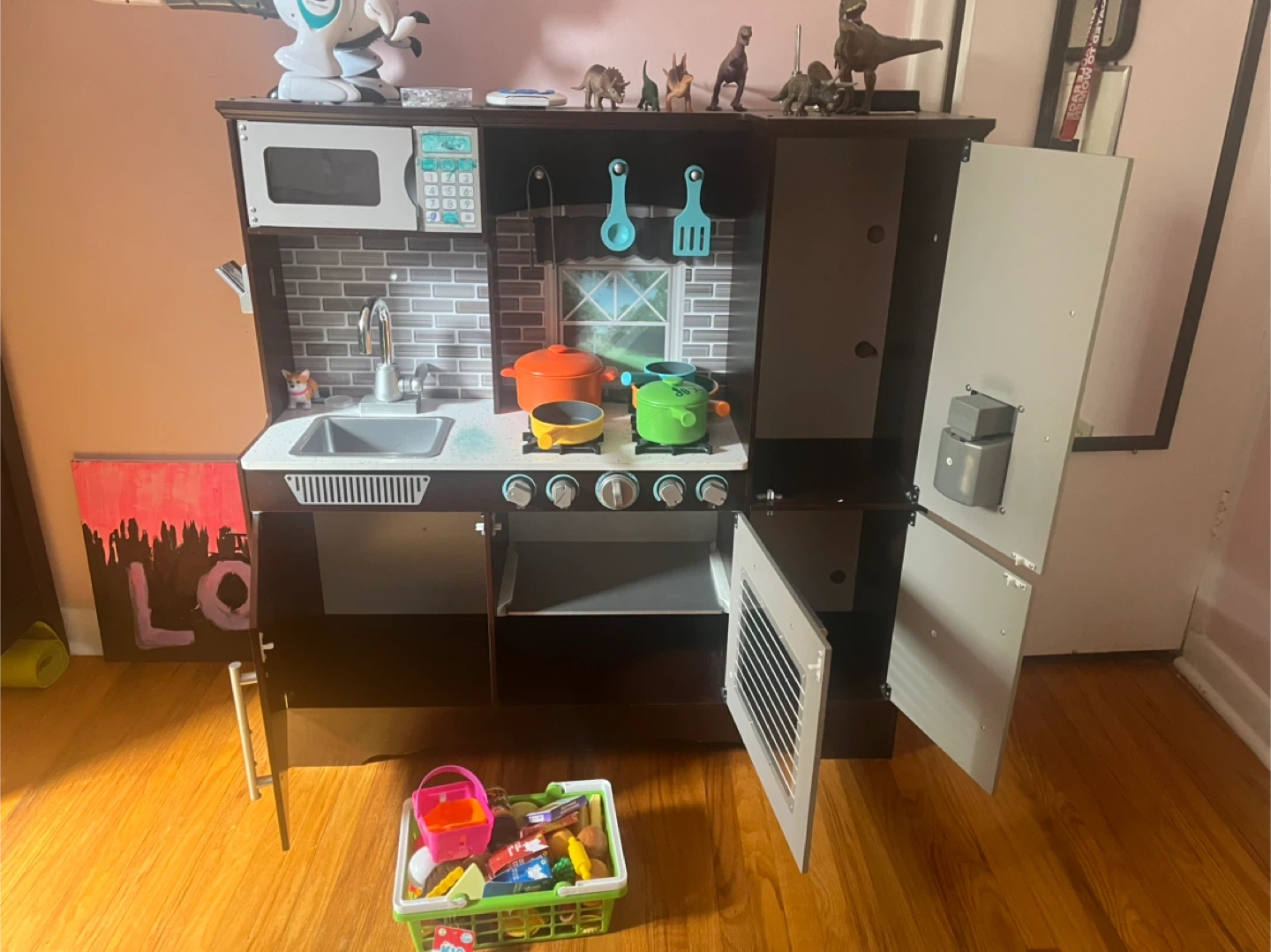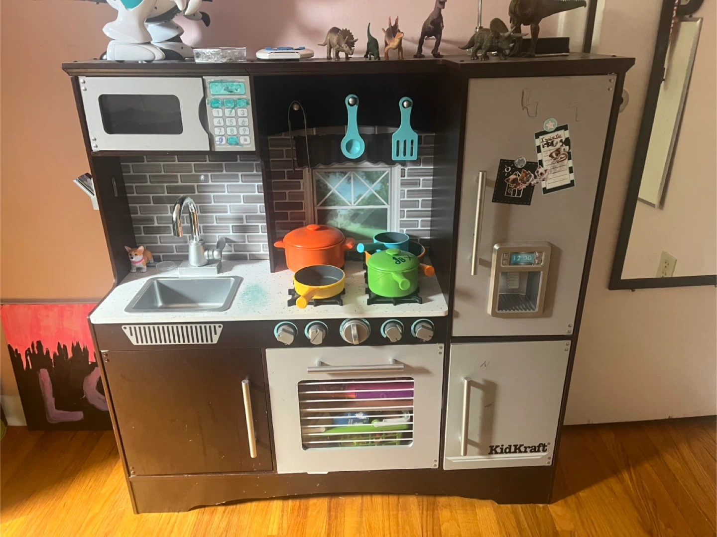 Selling a KidKraft wooden play kitchen. It comes with a basket full of play food and accessories. There are some signs of use, including some marks on the microwave panel and some drawings on the refrigerator door. Still lots of fun left!