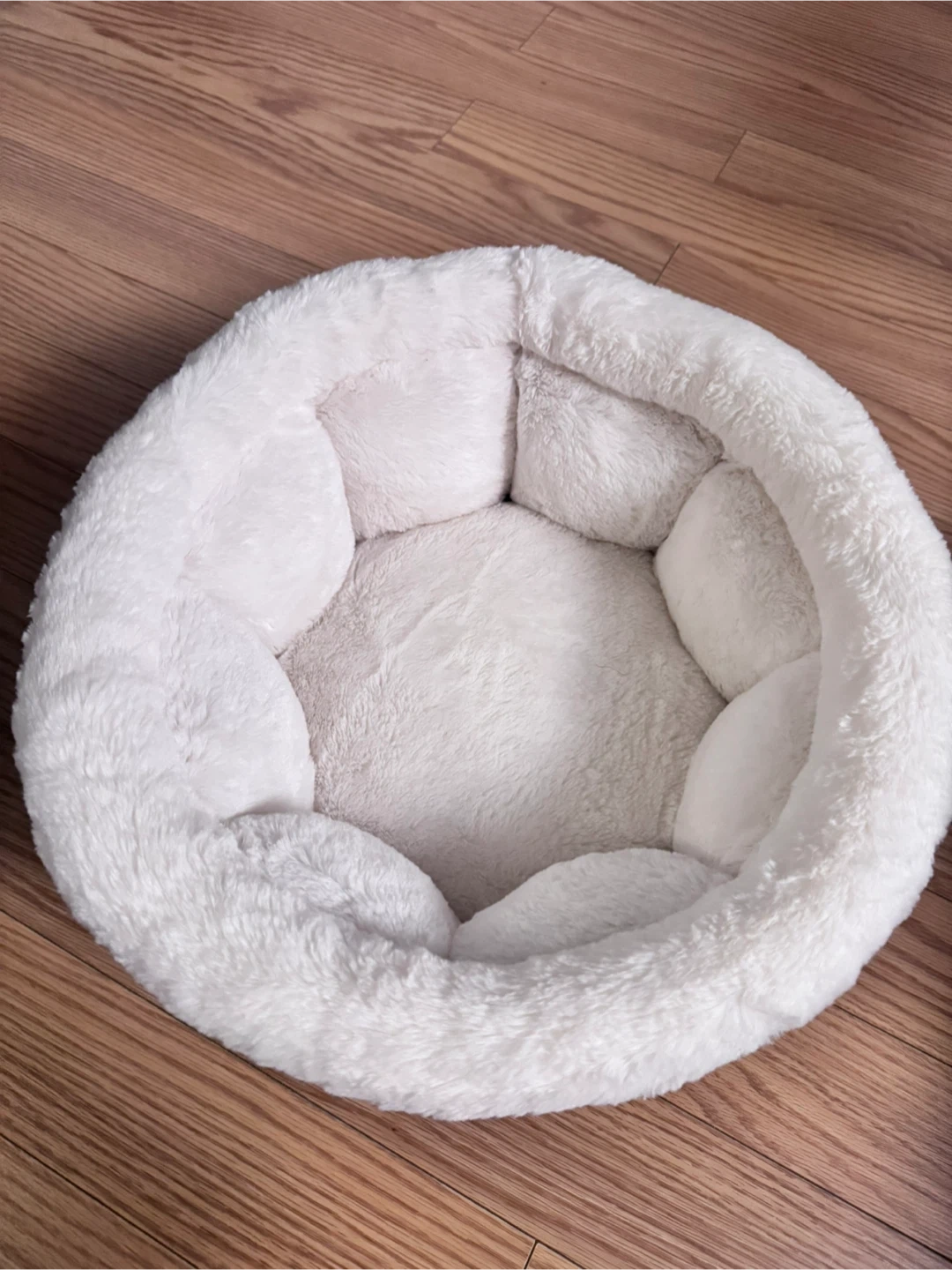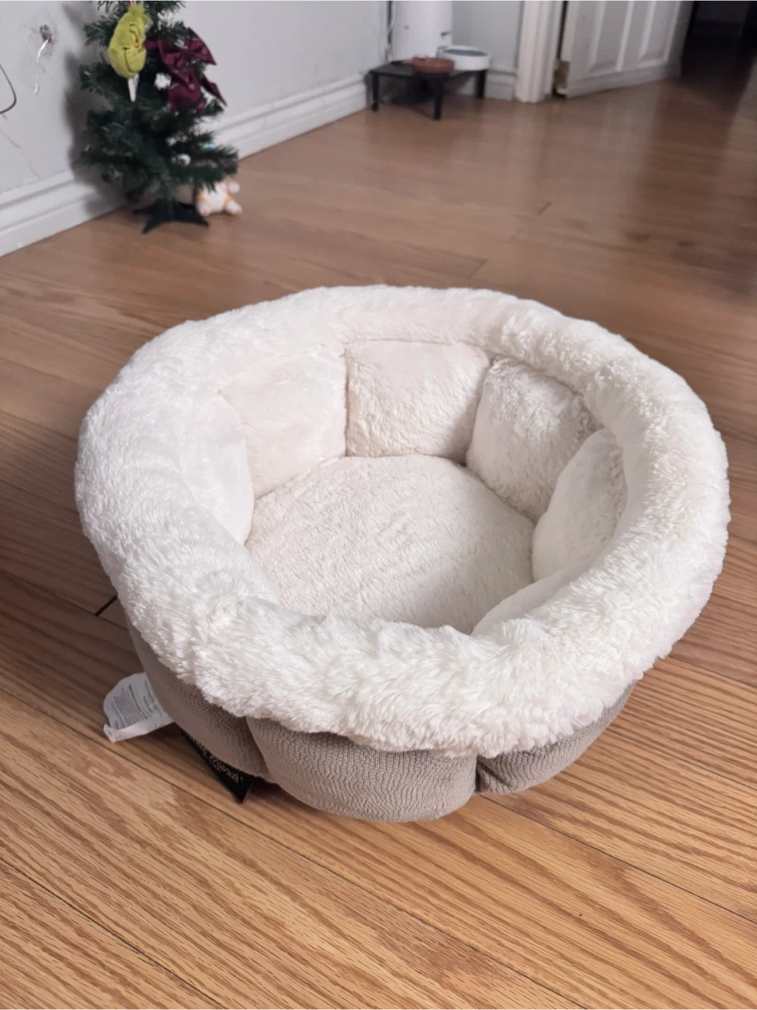 A comfy, fluffy, round pet bed! It's in great condition, not used and perfect for a small dog or cat. The bed is white and grey, and super soft and plushy