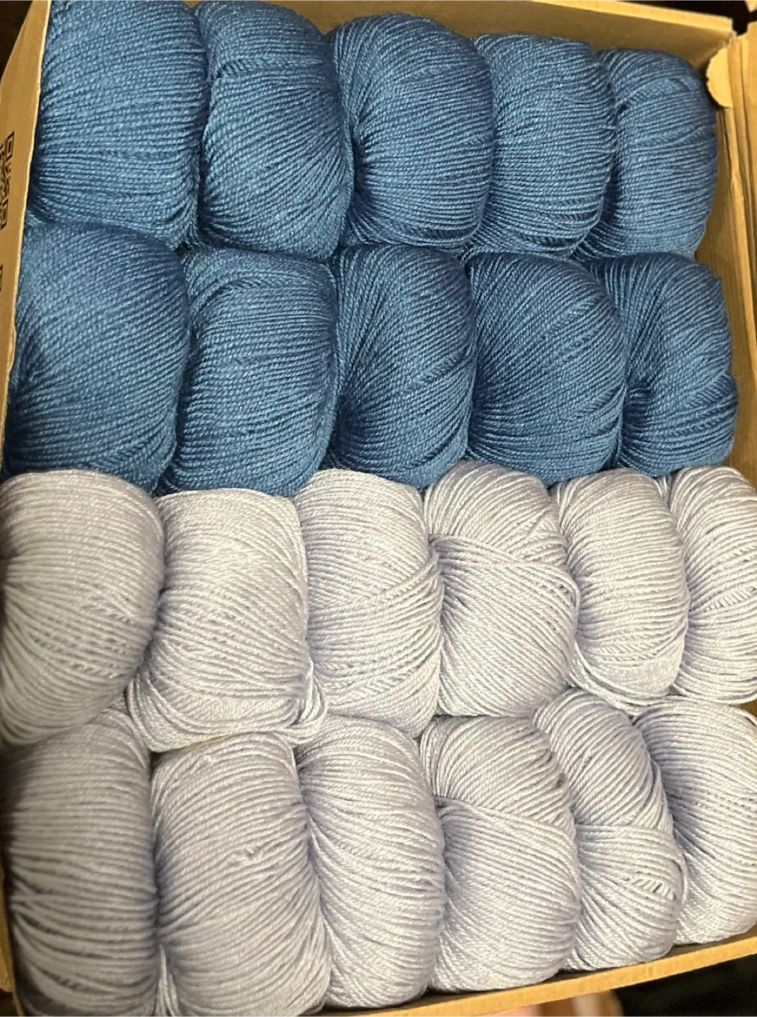 A bulk 24 balls lot of skeins of yarn, featuring 10 in a rich blue and 12 in a soft light grey. This yarn is ready for your next knitting or crochet project!