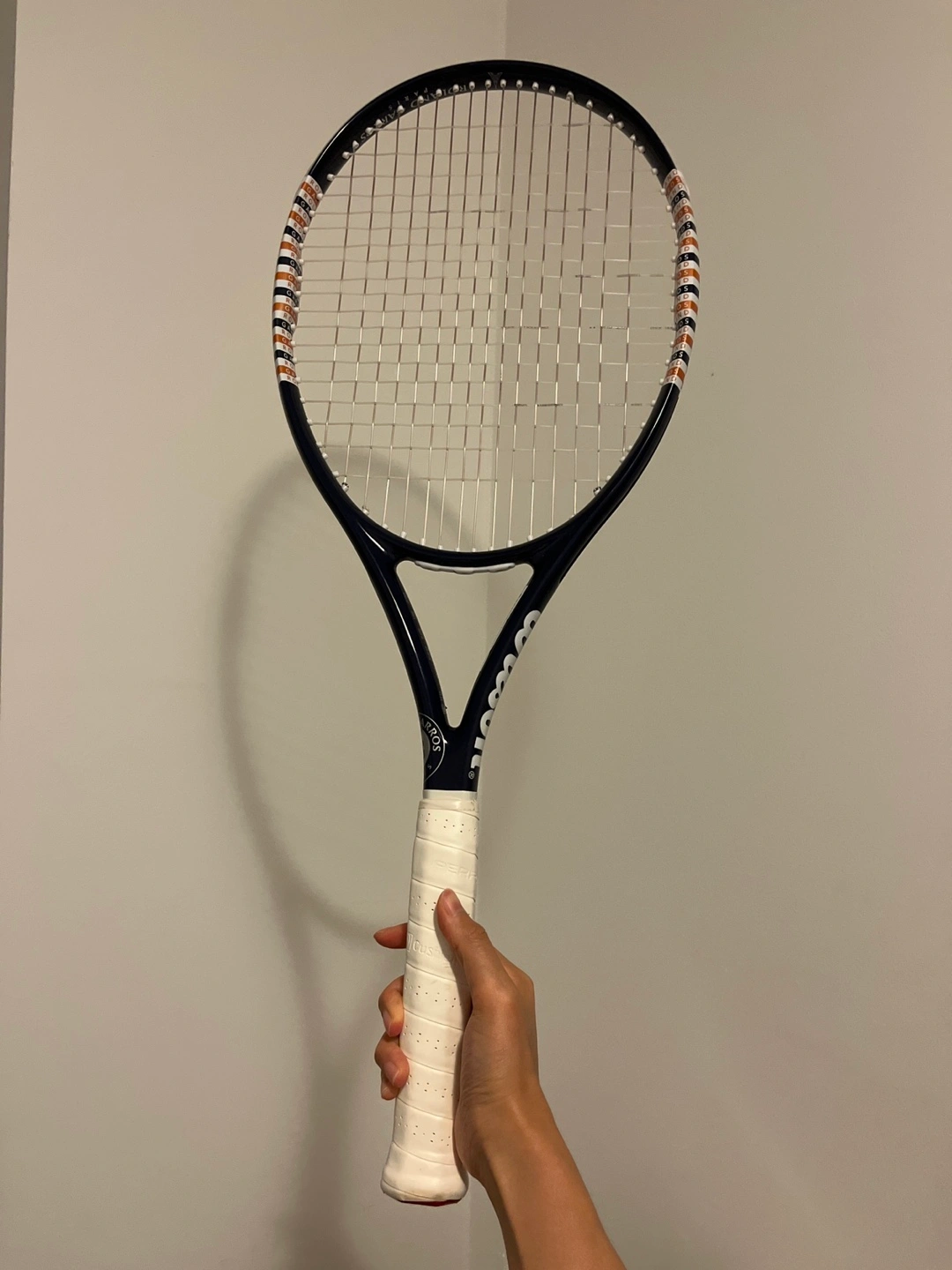** The strings have been recently replaced with a 'Wilson Duo II Hybrid (Luxilon Adrenaline 16L/1.25 & Wilson NXT 16/1.30)', offering a nice balance of power and control.