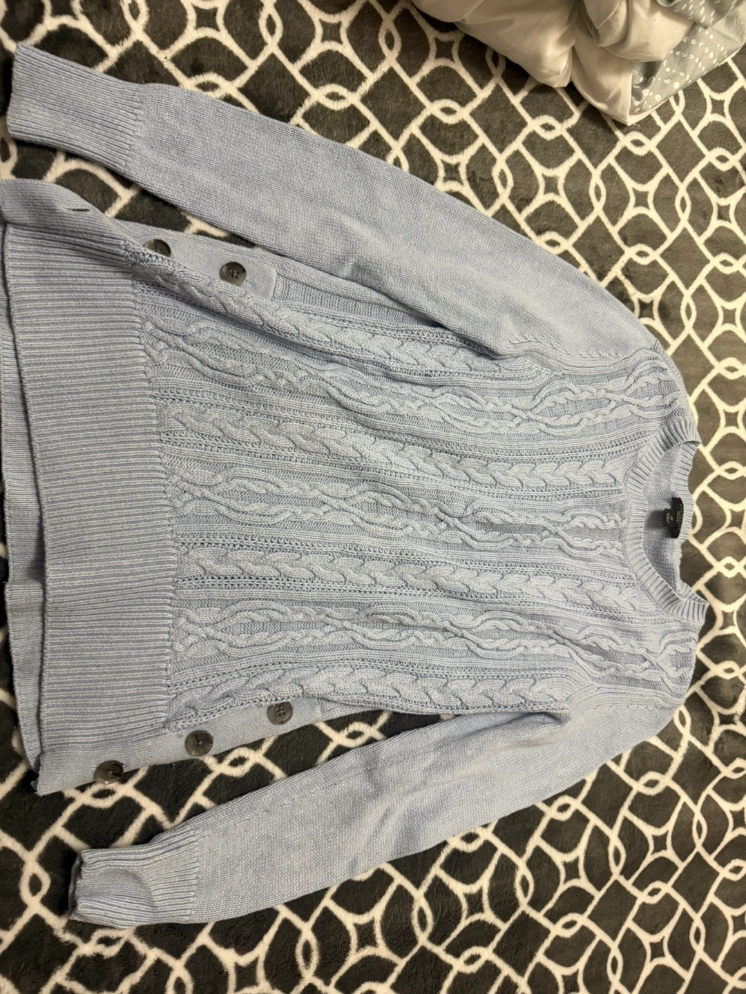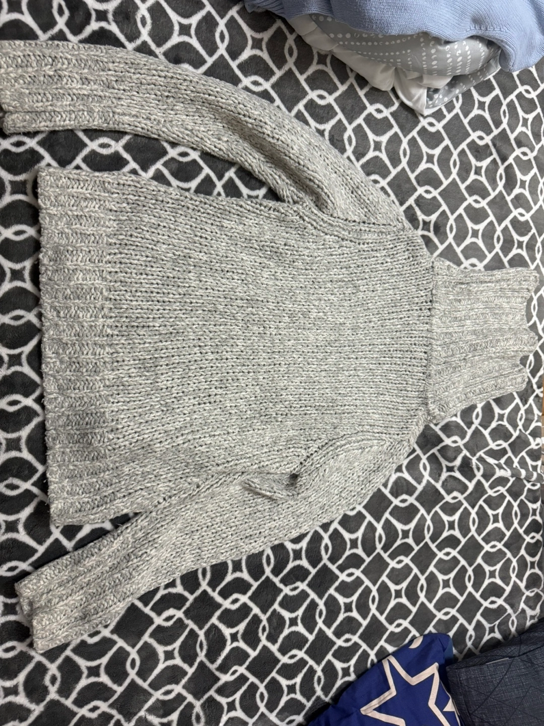 Selling an Ann Taylor Factory Petite sweater in size M.It's a light blue colour with a cable knit design. Perfect for layering or wearing on its own. And grey knitted sweater.