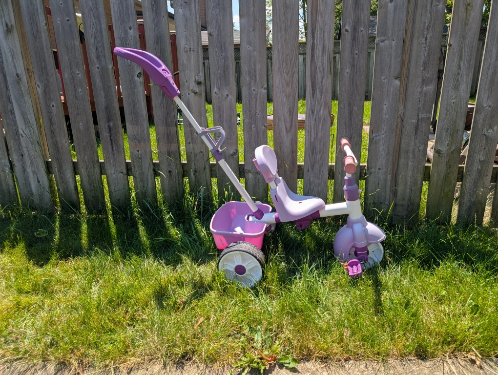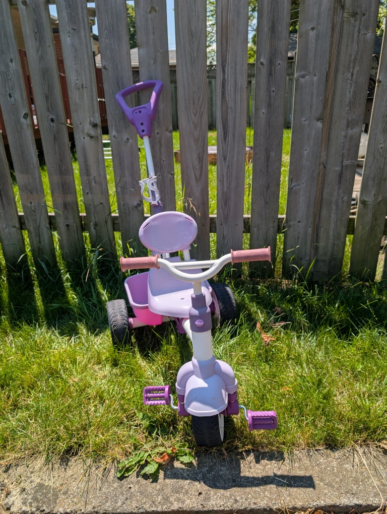 Little Tikes 4 in 1 tricycle in good used condition. Missing sunshade and harness. Switches from adult push to child powered. Push handle has 3 height settings. Seat has 3 adjustable settings to go closer or farther from handle bars and pedals. Handle bars lock and unlock to allow child to guide the bike or to freely move them while an adult controls them. Bottle holder. Basket tips to allow for dumping. Headrest can be removed.