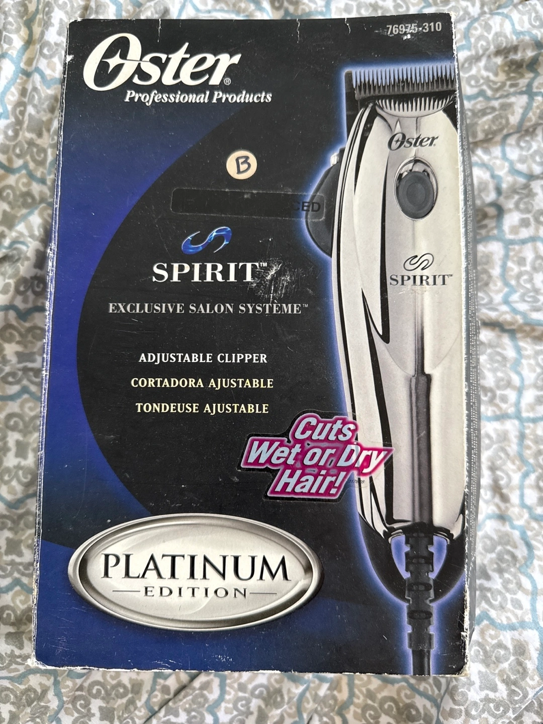 Selling an Oster Spirit Platinum Edition clipper. It's an adjustable clipper that cuts wet or dry hair. Comes with all the attachments in the box as shown in the pictures!