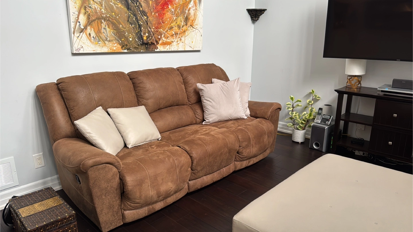 Selling a comfy brown reclining sofa. It's perfect for relaxing after a long day! It shows some signs of use but is still in good condition for lounging and watching movies
